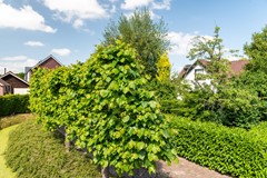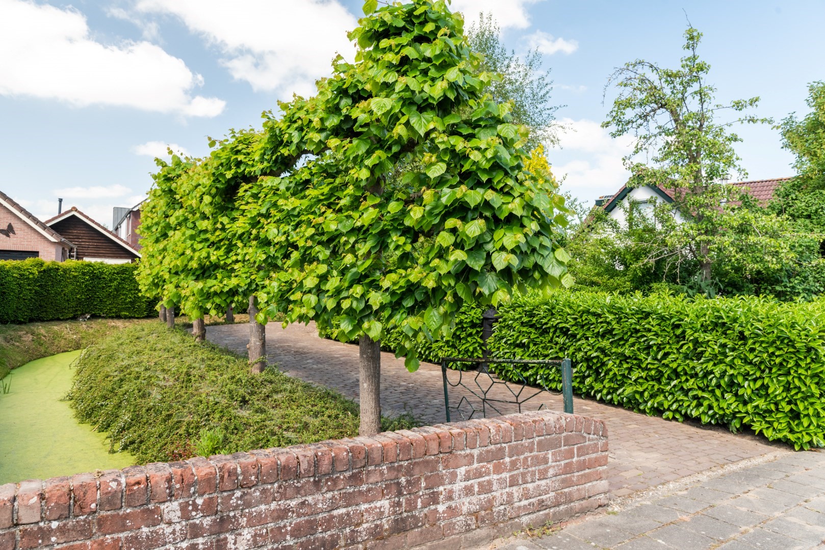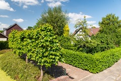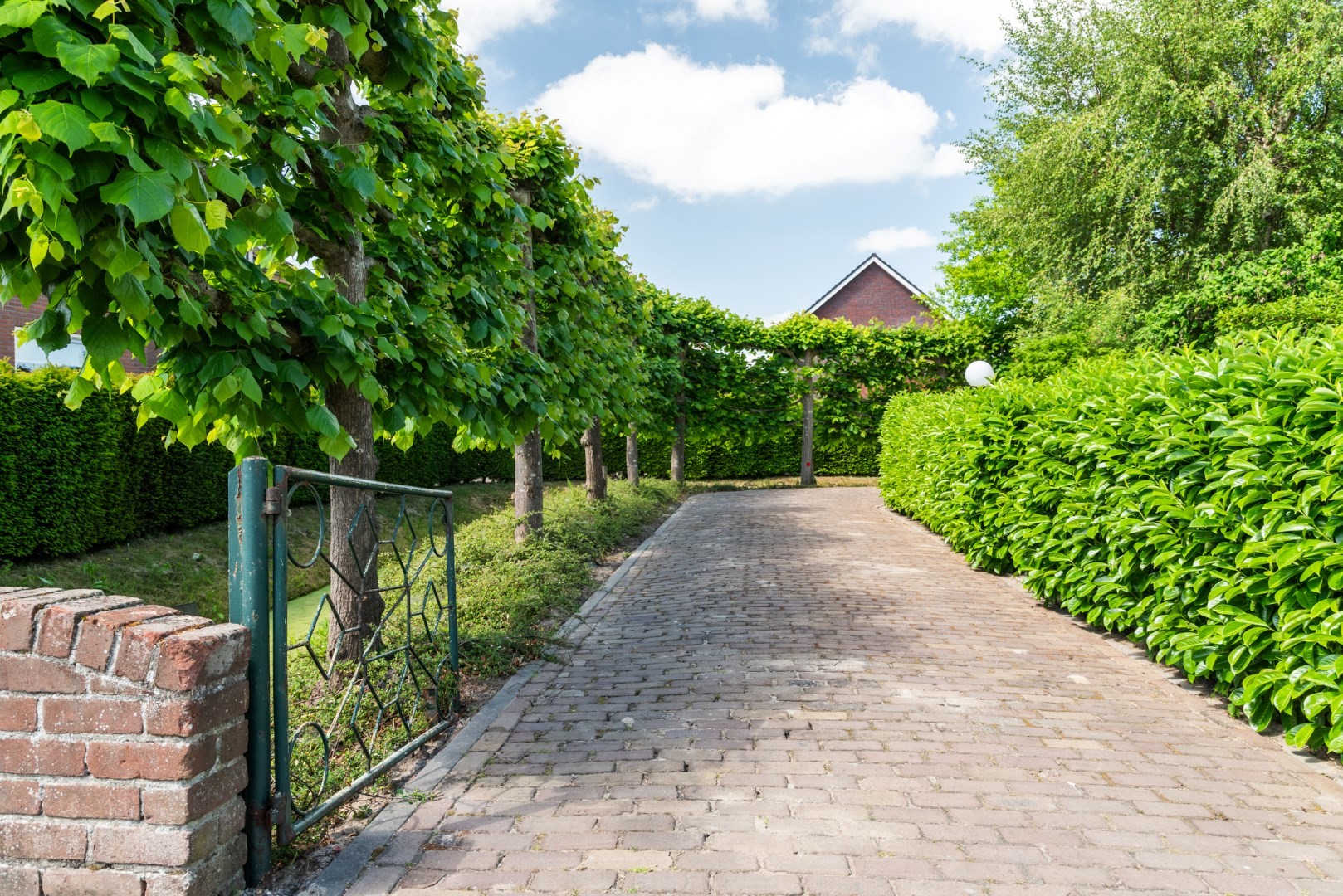 De groene oprijlaan met fraaie leibomen en sierbestrating vormt een sfeervolle entree en geeft direct een voorproefje van wat je achter de voordeur kunt verwachten: ruimte, licht en een heerlijke leefomgeving – binnen én buiten.