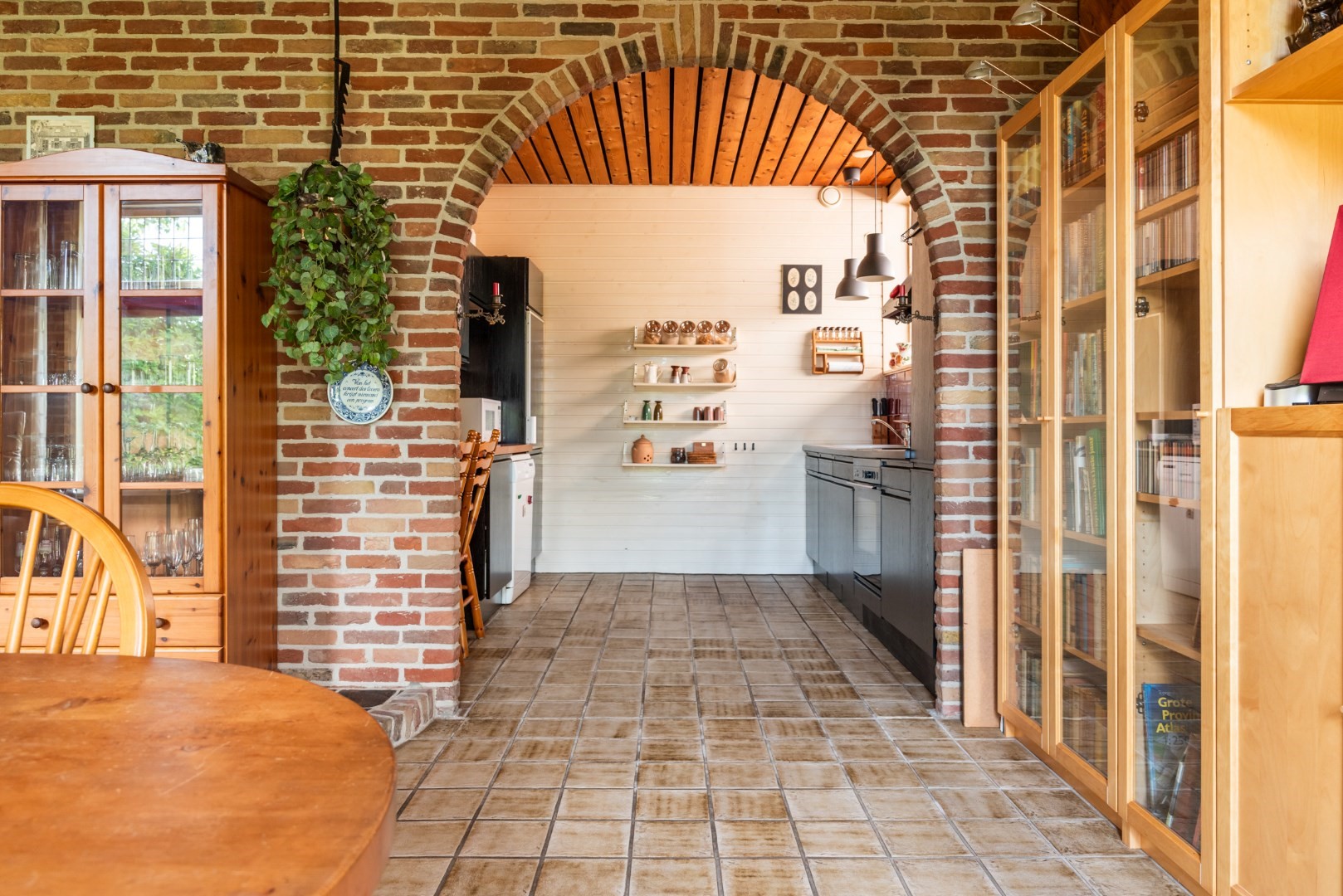 Een speels detail is het gezellige doorkijkje met zitje naar de woonkamer – ideaal voor een kop koffie of een praatje tijdens het koken.