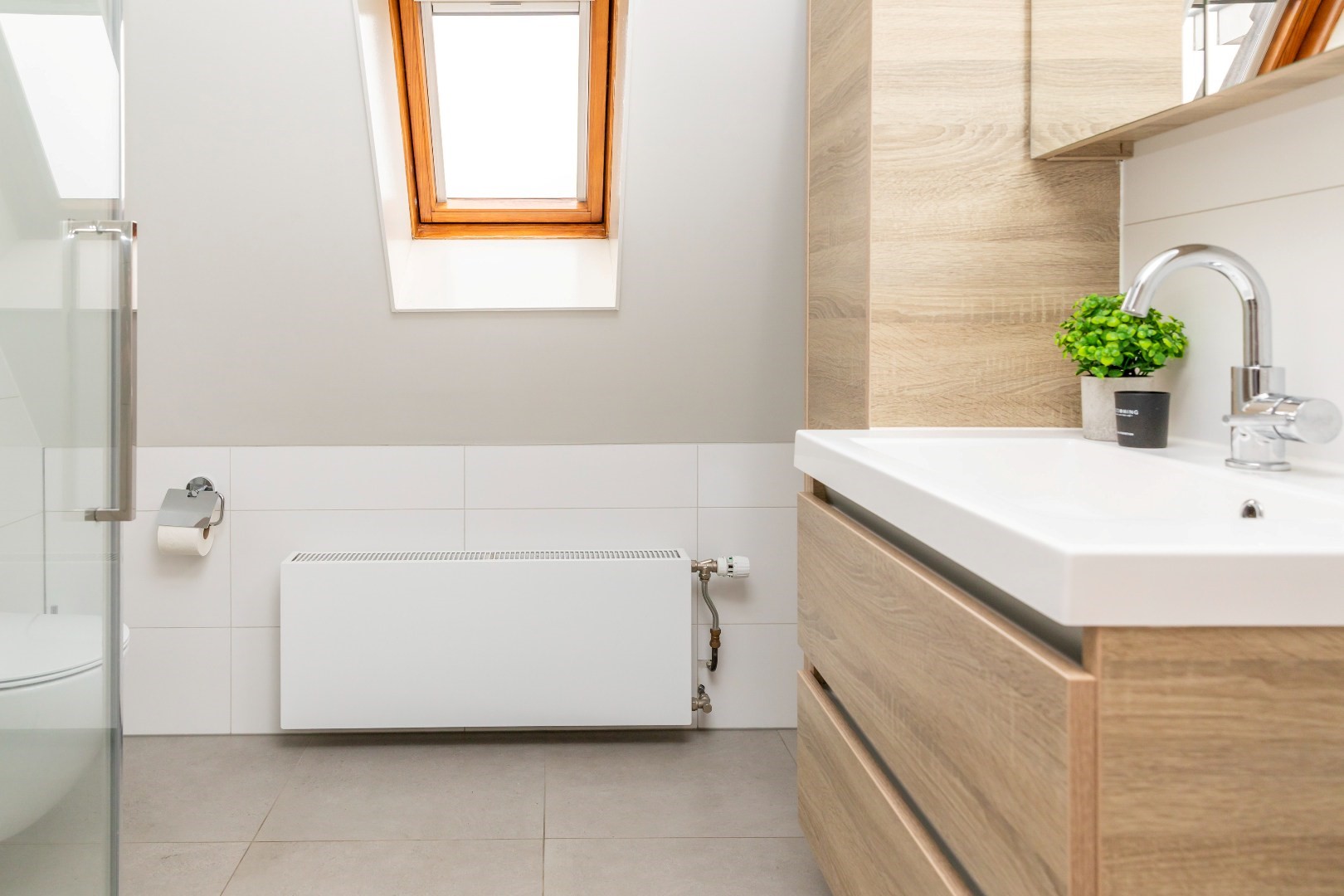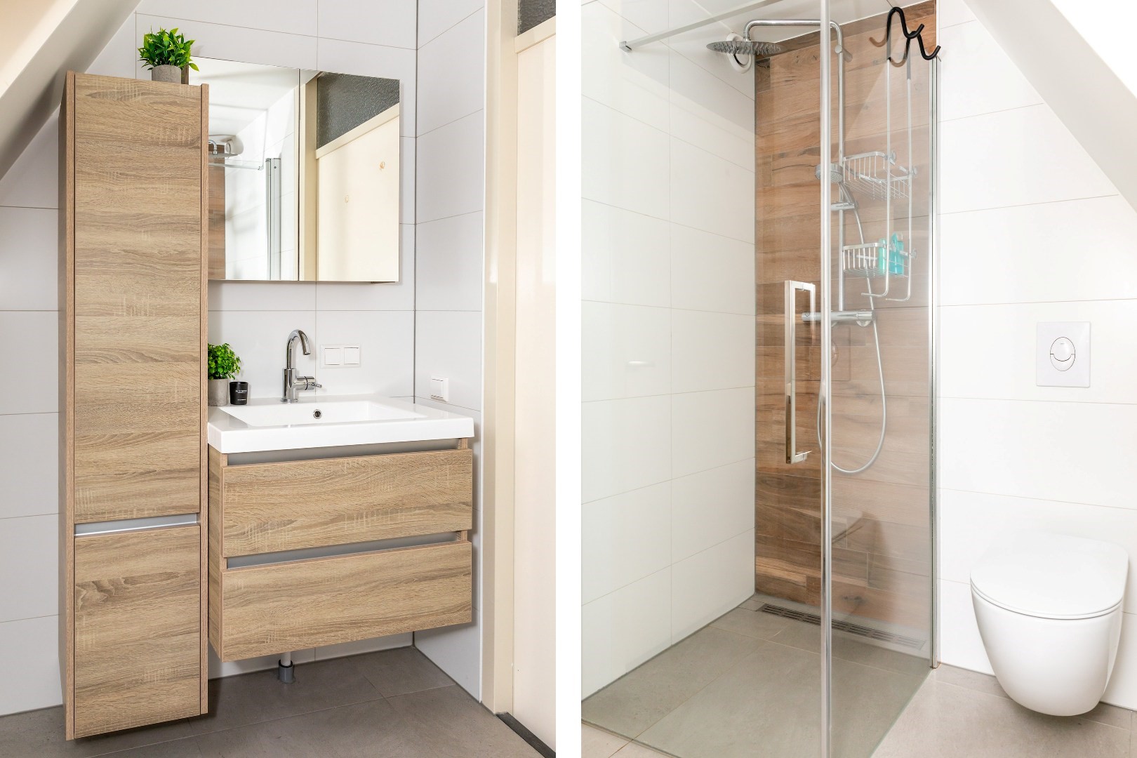 De vernieuwde, lichte badkamer is praktisch en stijlvol ingericht met een douche, toilet en badmeubel.