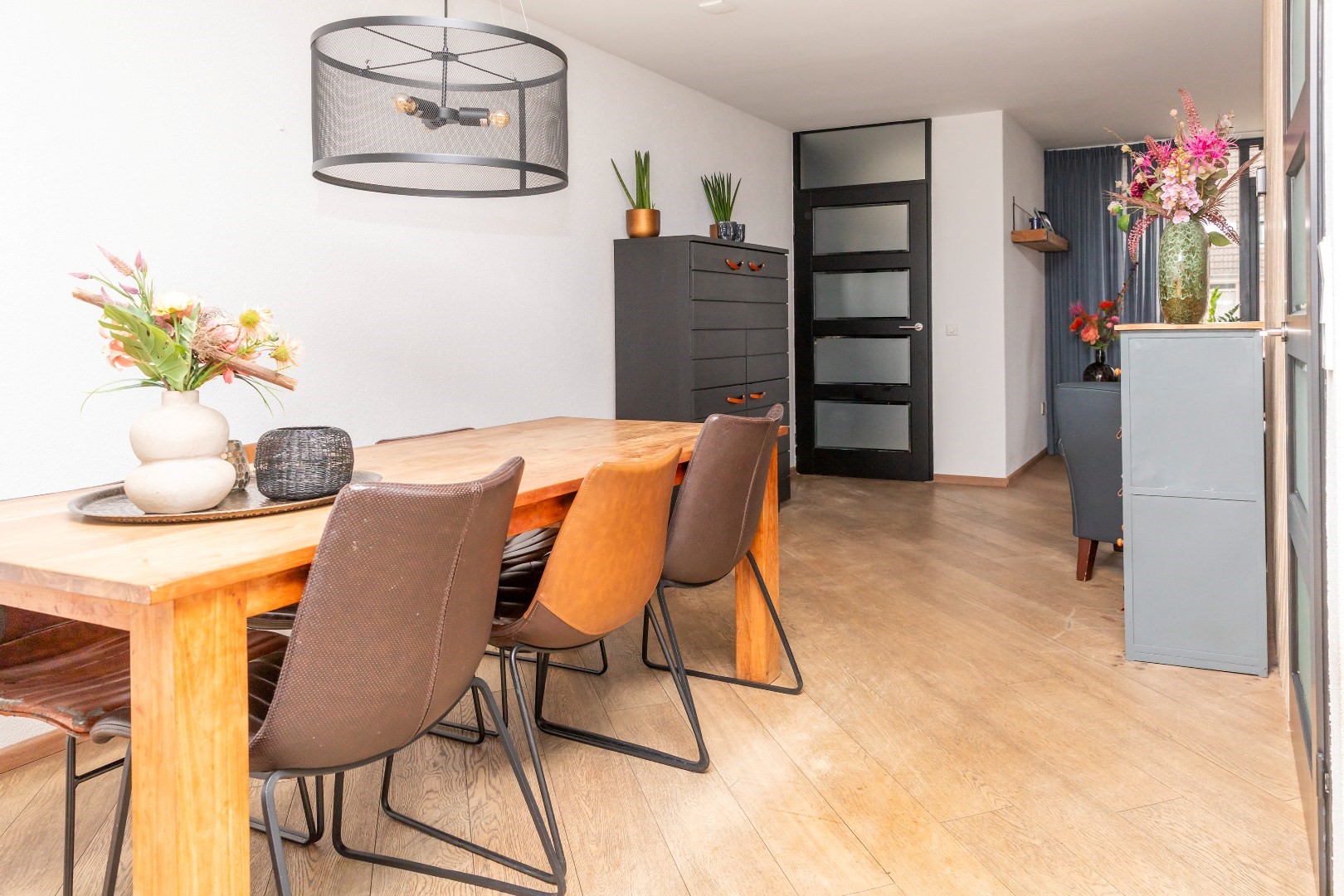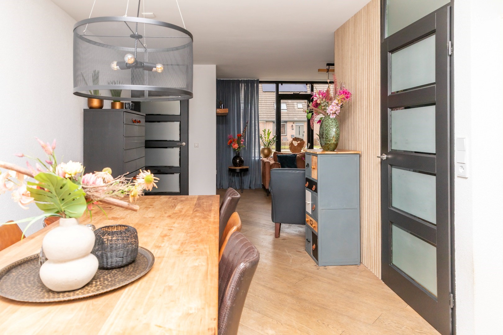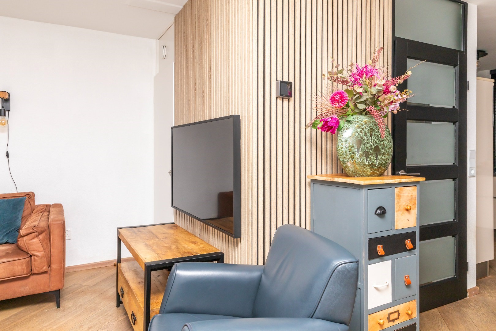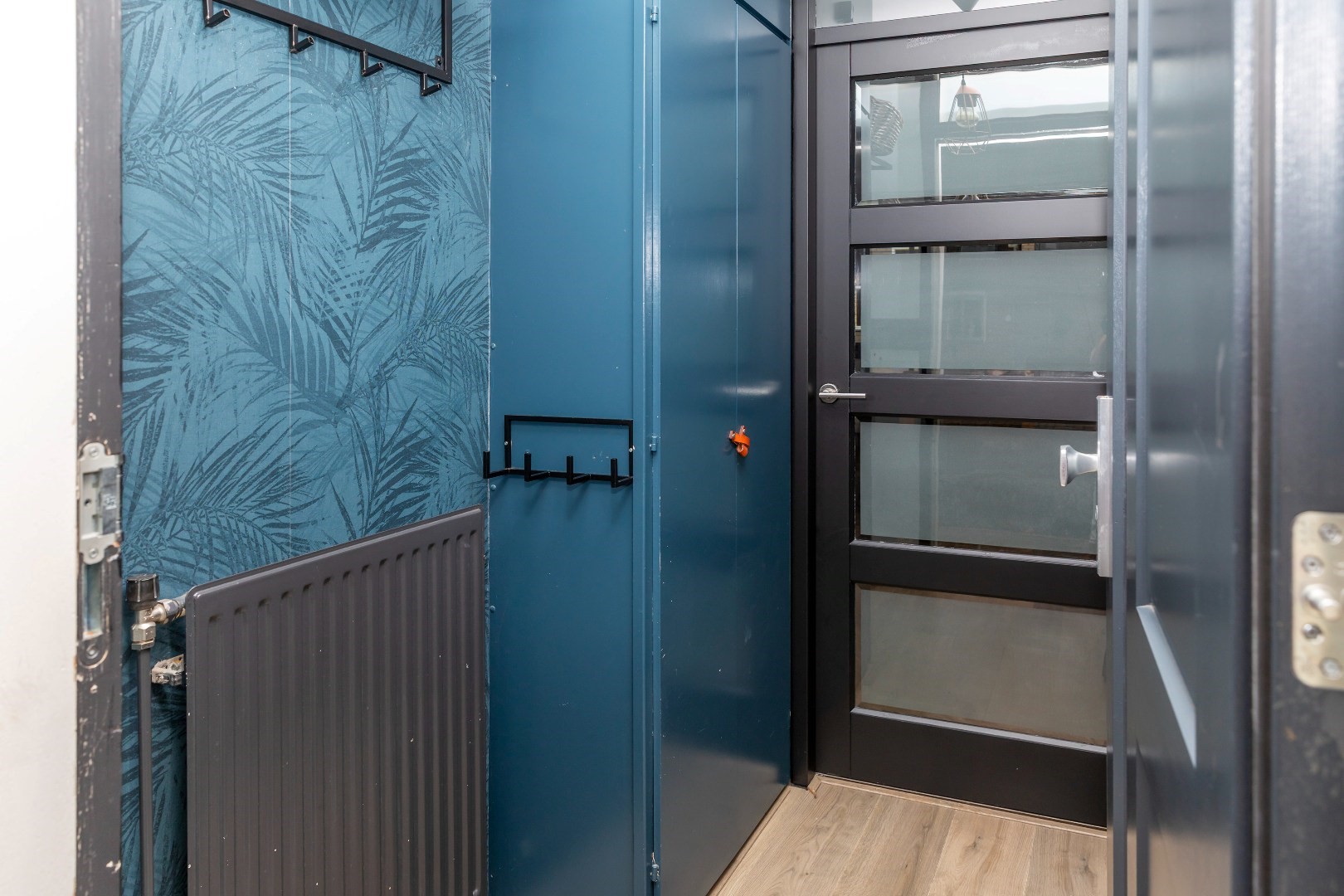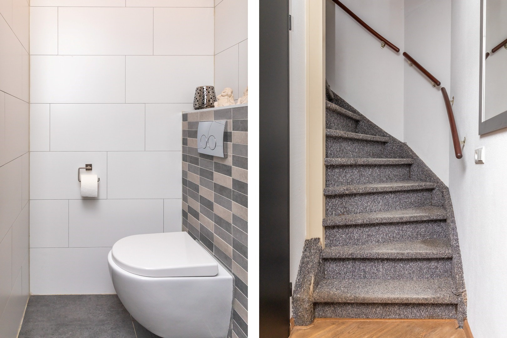 Centraal in de woning bevindt zich het afgesloten portaal met de trapopgang naar de eerste verdieping en het vernieuwde toilet, wat bijdraagt aan het moderne en verzorgde geheel.