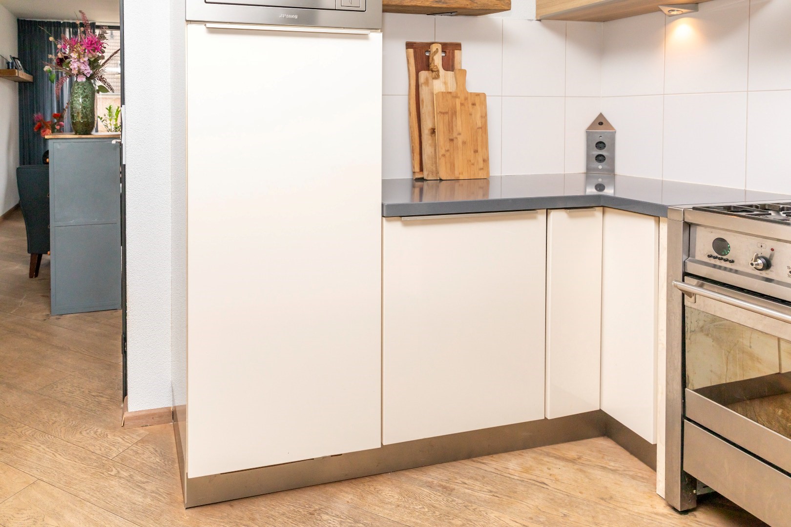 Aan de achterzijde ligt de lichte inbouwkeuken, compleet uitgerust met alle benodigde inbouwapparatuur.