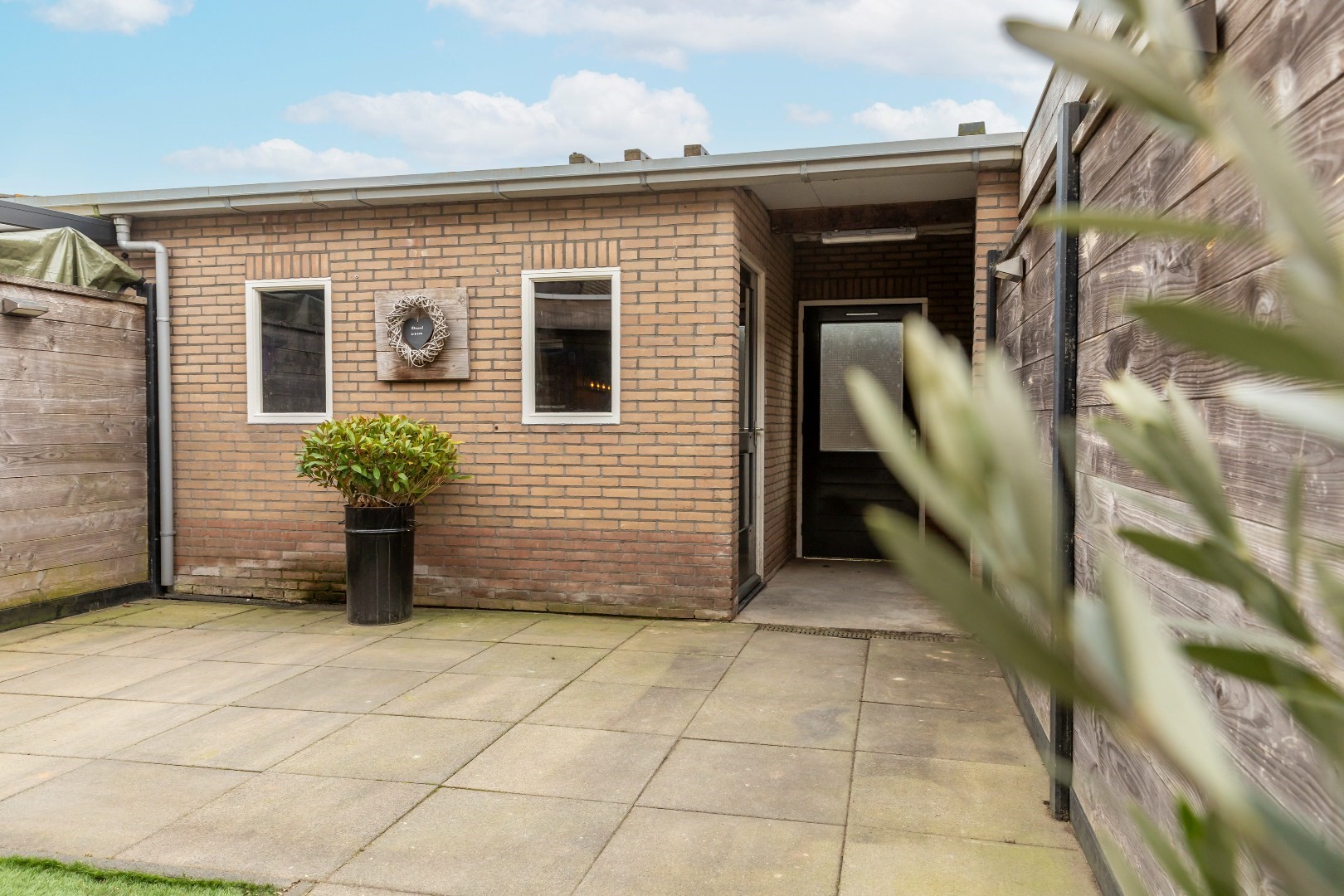 Achter in de tuin staat een stenen berging en via de achterom is de tuin gemakkelijk bereikbaar.