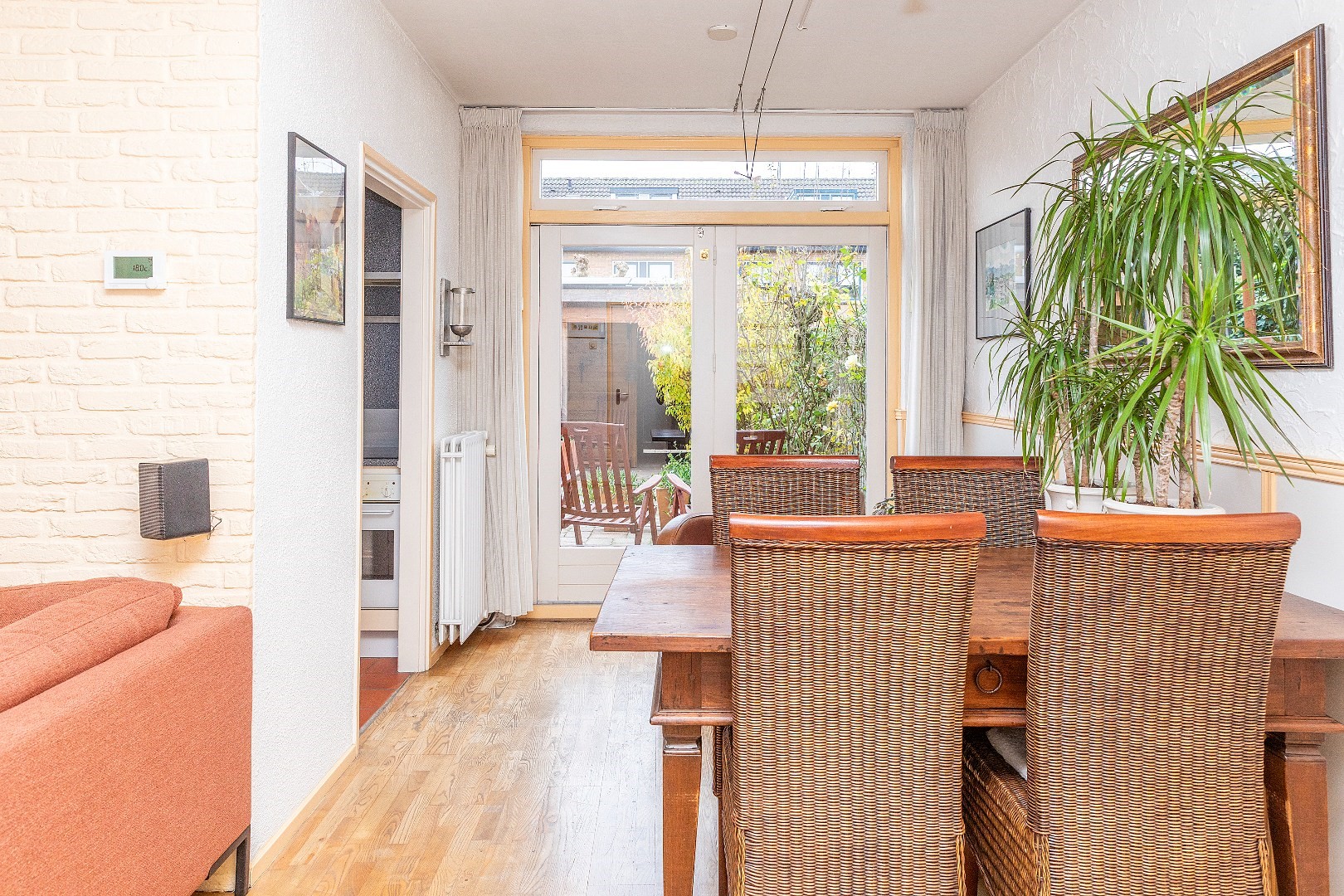 Aan de achterzijde bevindt zich de ruime eethoek met openslaande deuren naar de zonnige tuin op het westen.