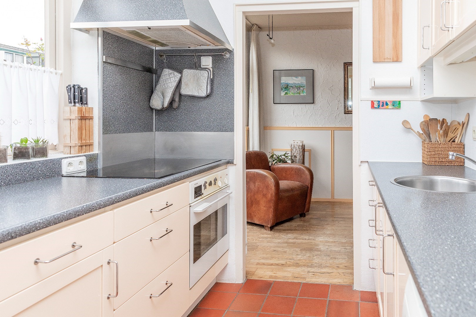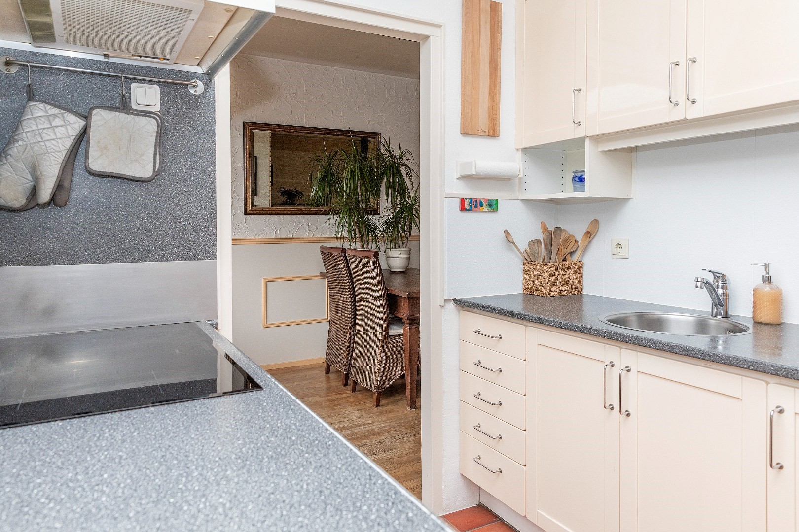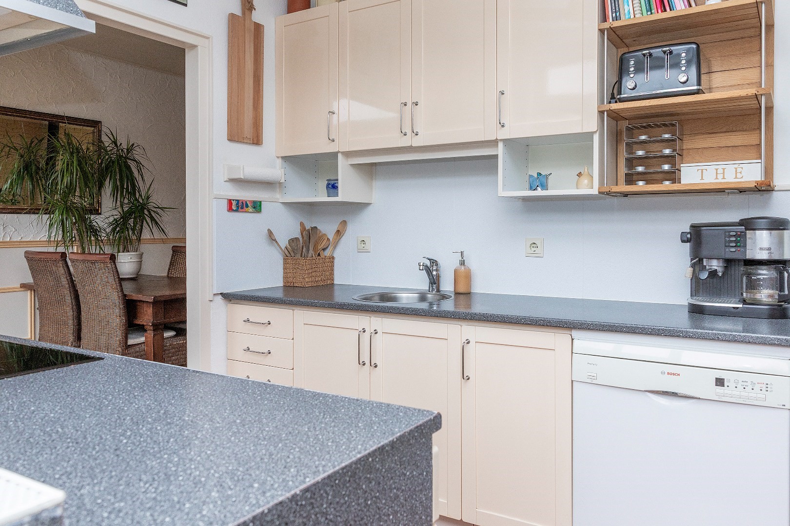 In directe verbinding met de eethoek ligt de halfopen keuken, waar in 2024 nog een nieuwe brede inductiekookplaat is geplaatst op een verzwaarde kookgroep.