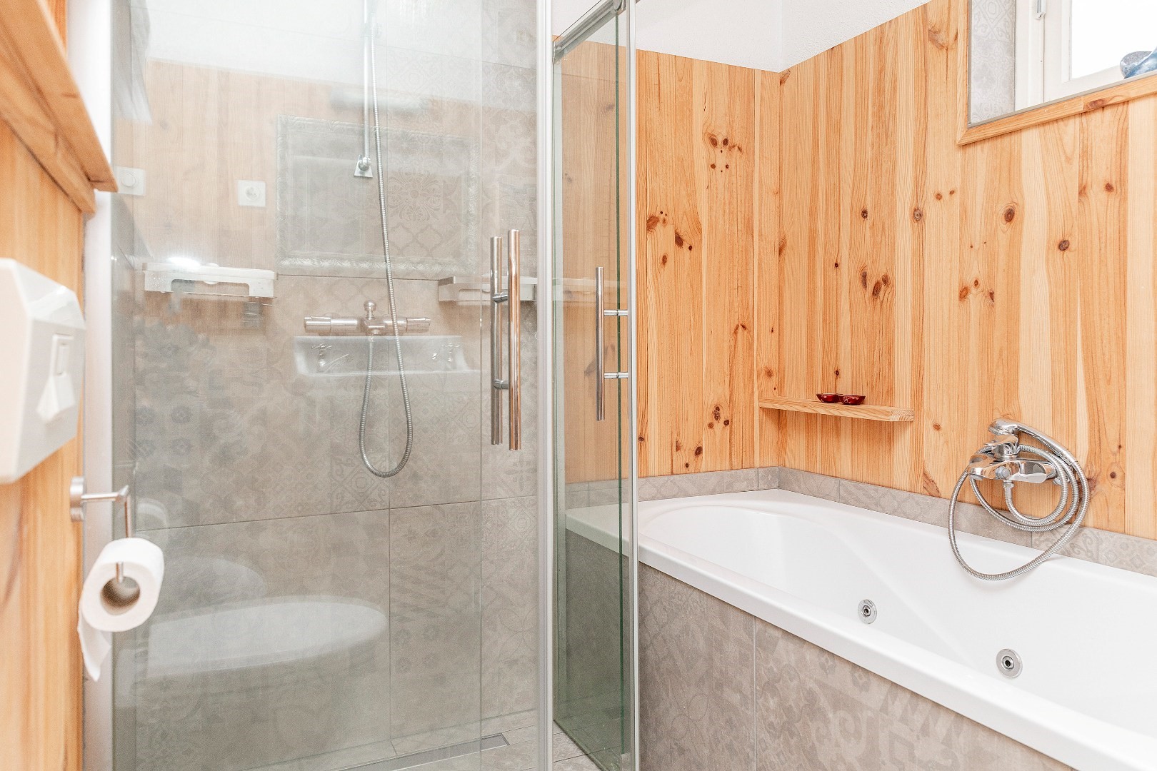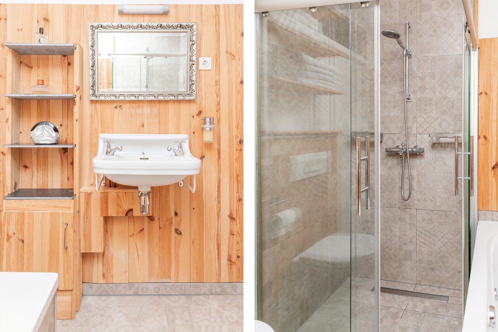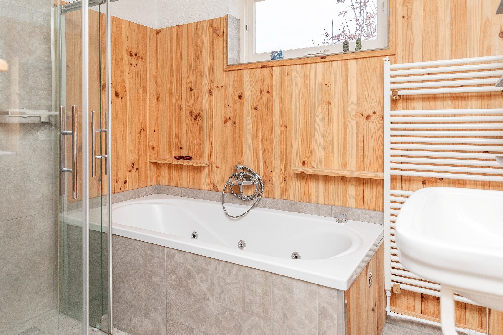 De complete badkamer uit 2022 heeft sfeer met de sauna-look houten wanden en is voorzien van een ligbad, een separate douche, een wastafel, een vrij-hangend toilet en een designradiator.