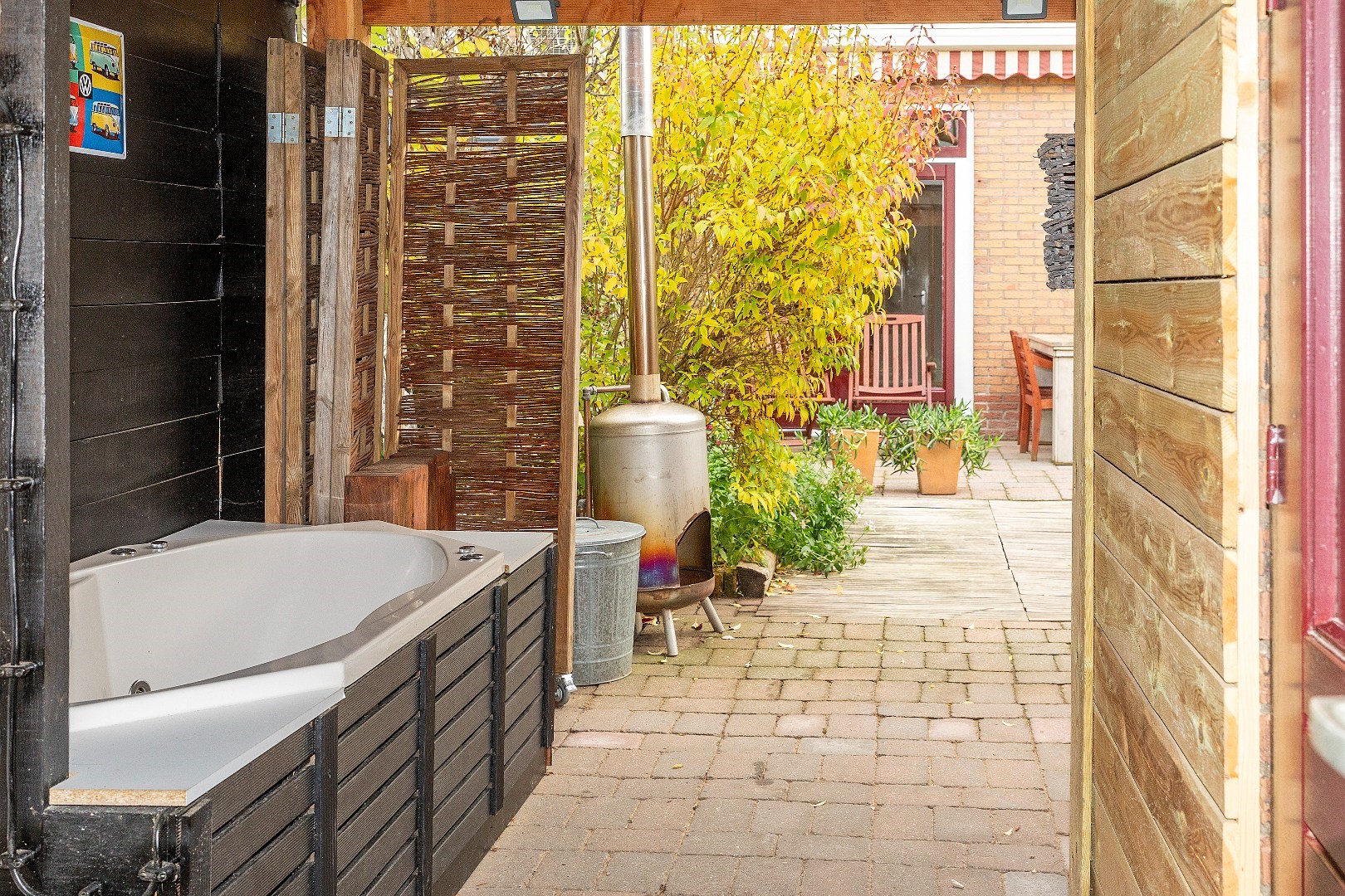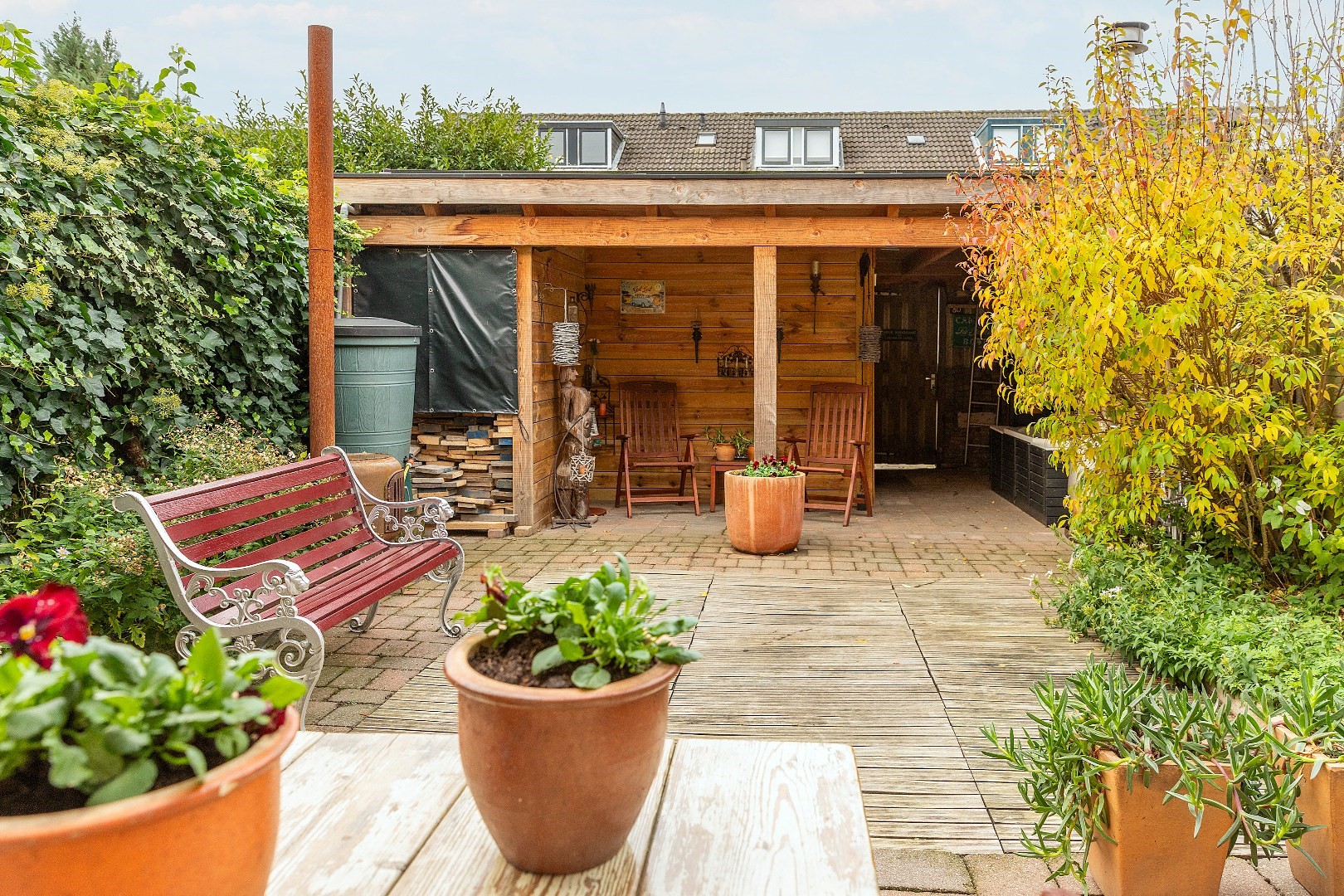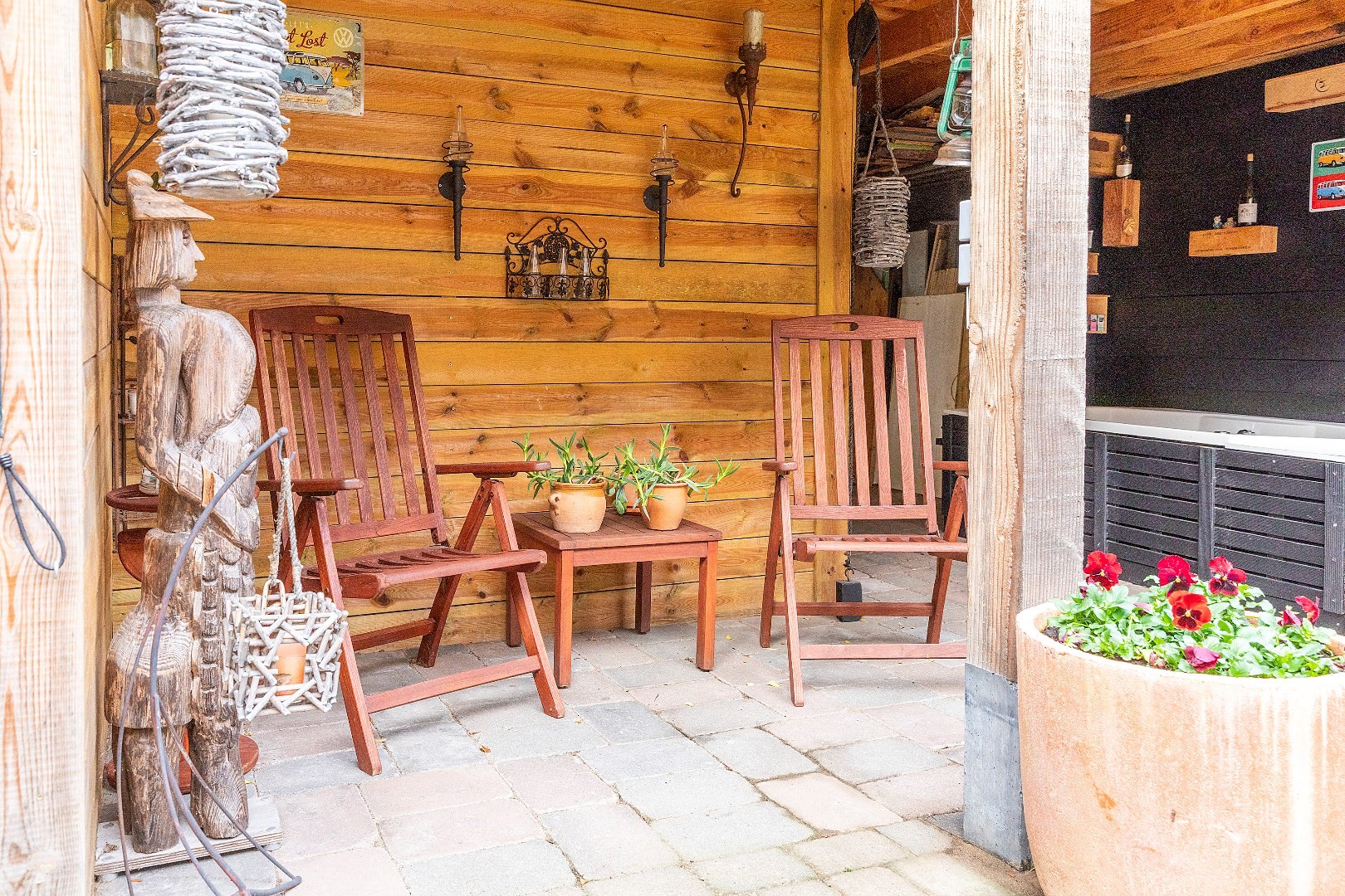 In 2022 is er een royale veranda gebouwd, waardoor er een sfeervolle overdekte zithoek is ontstaan. Hier is ook gedacht aan ruim 6 m3 stookhoutopslag.