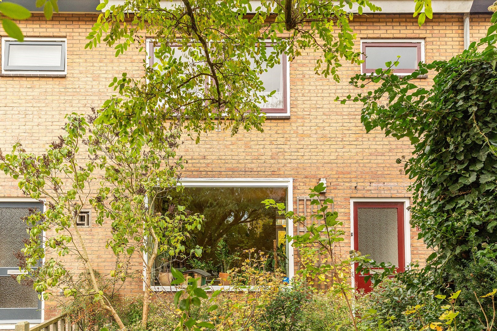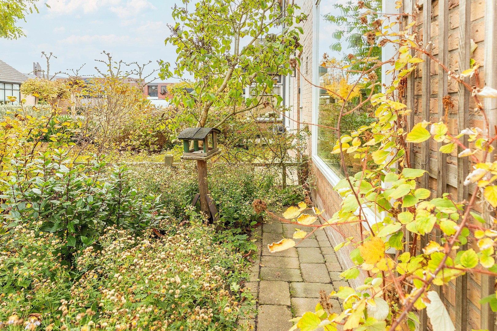 Aan straatzijde betreedt u de ruim negen meter lange voortuin met weelderige bomen en planten, een duidelijke ecologische voetafdruk.