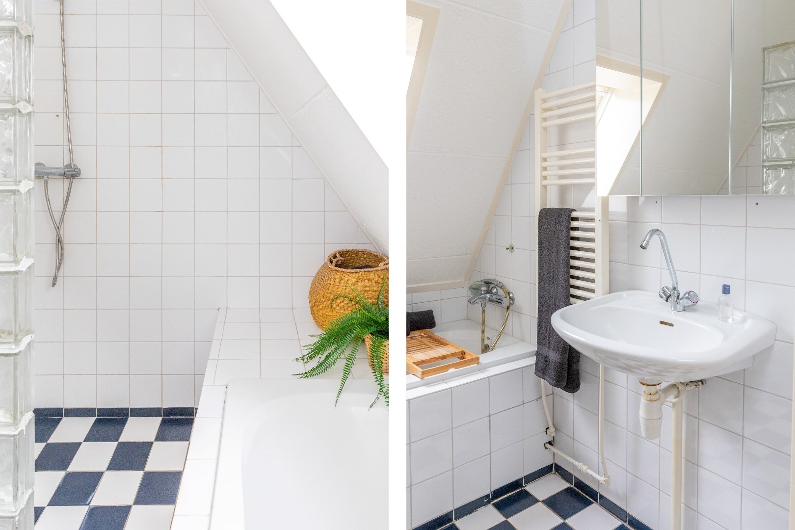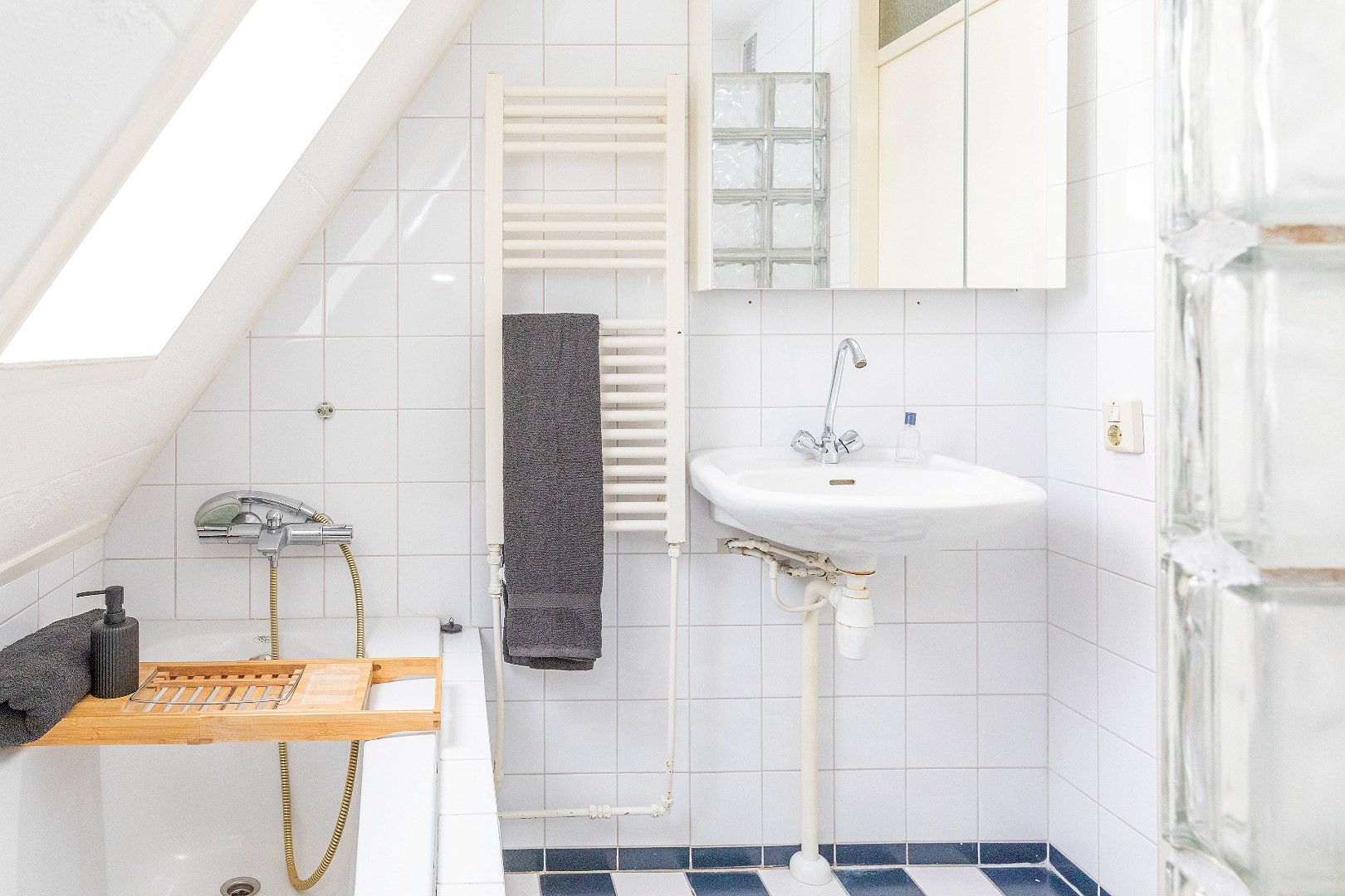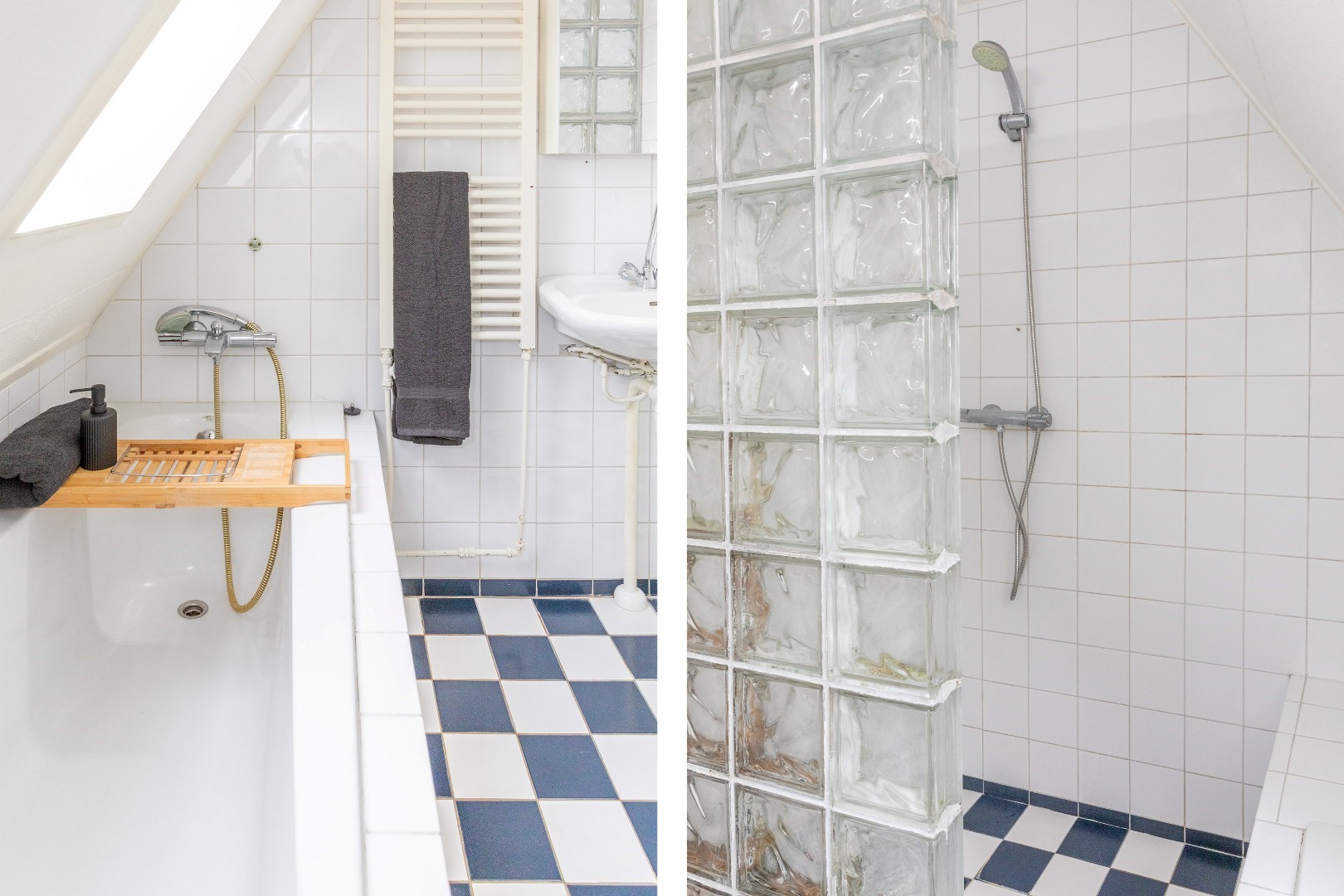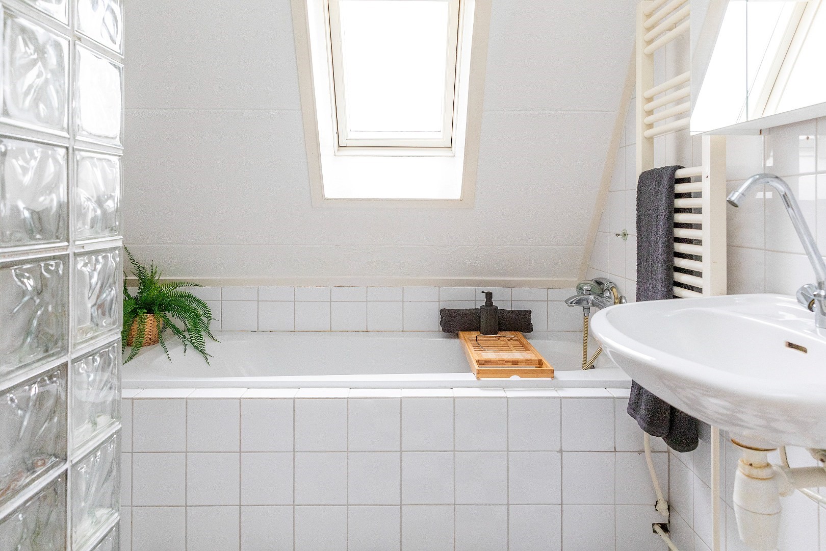 De badkamer is compleet uitgerust met een ligbad, separate douche, wastafel en designradiator.