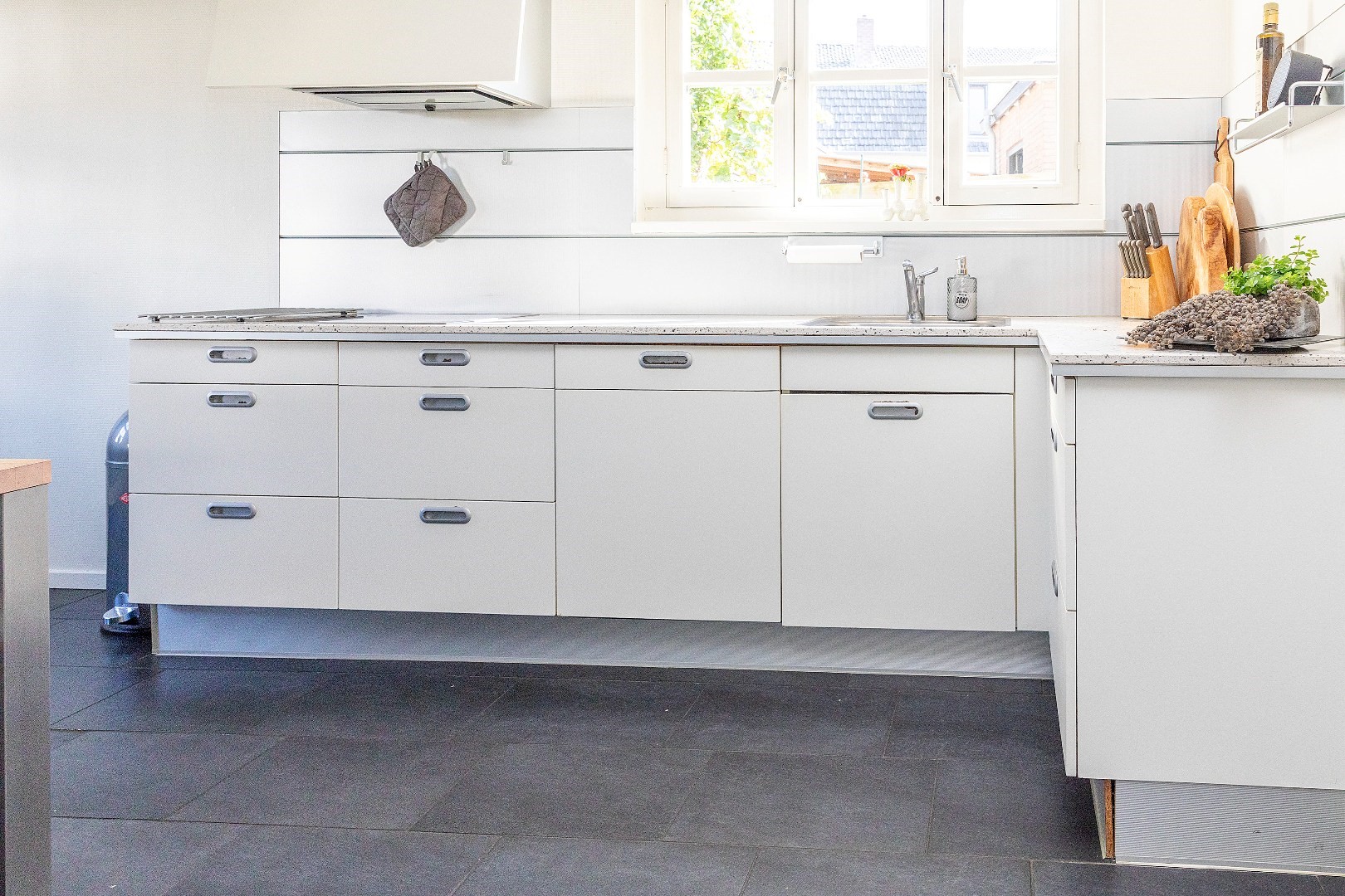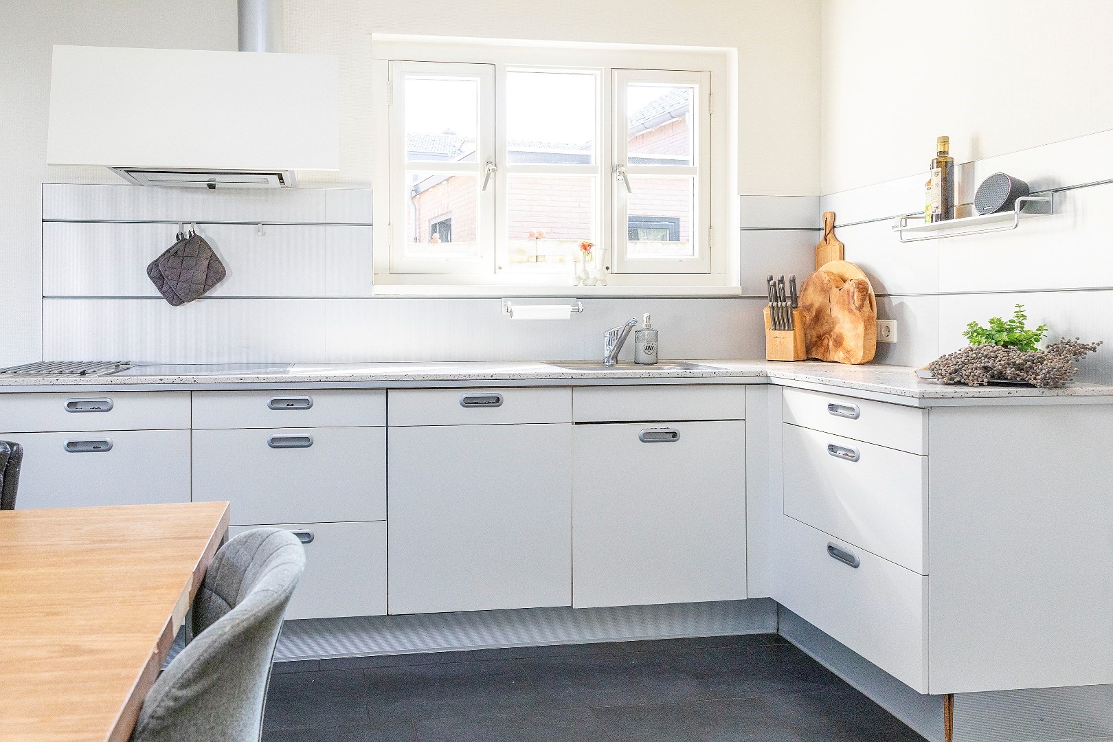 De woonkeuken bevindt zich aan de achterzijde en vormt het hart van het huis.