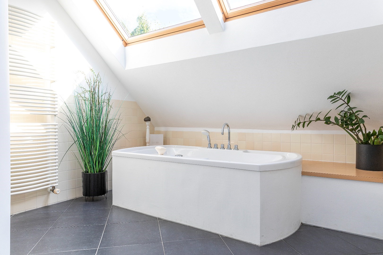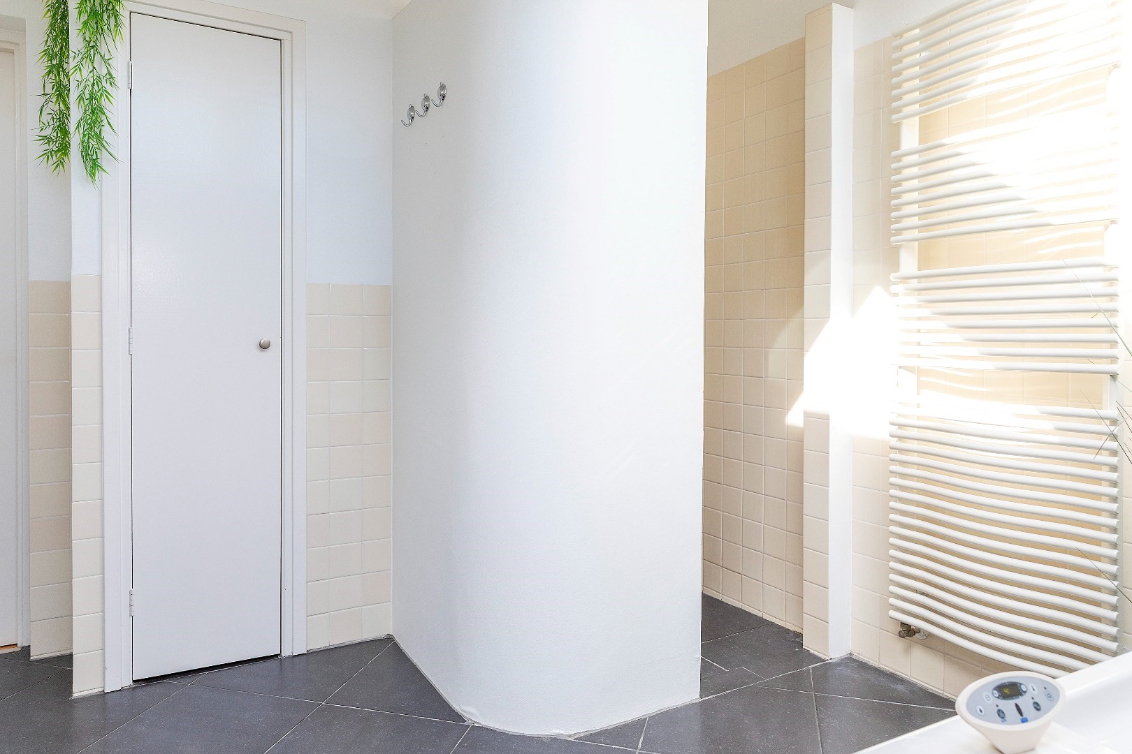 De badkamer is royaal en van alle gemakken voorzien: een ligbad, inloopdouche, toilet en een stijlvol wastafelmeubel met dubbele waskommen.