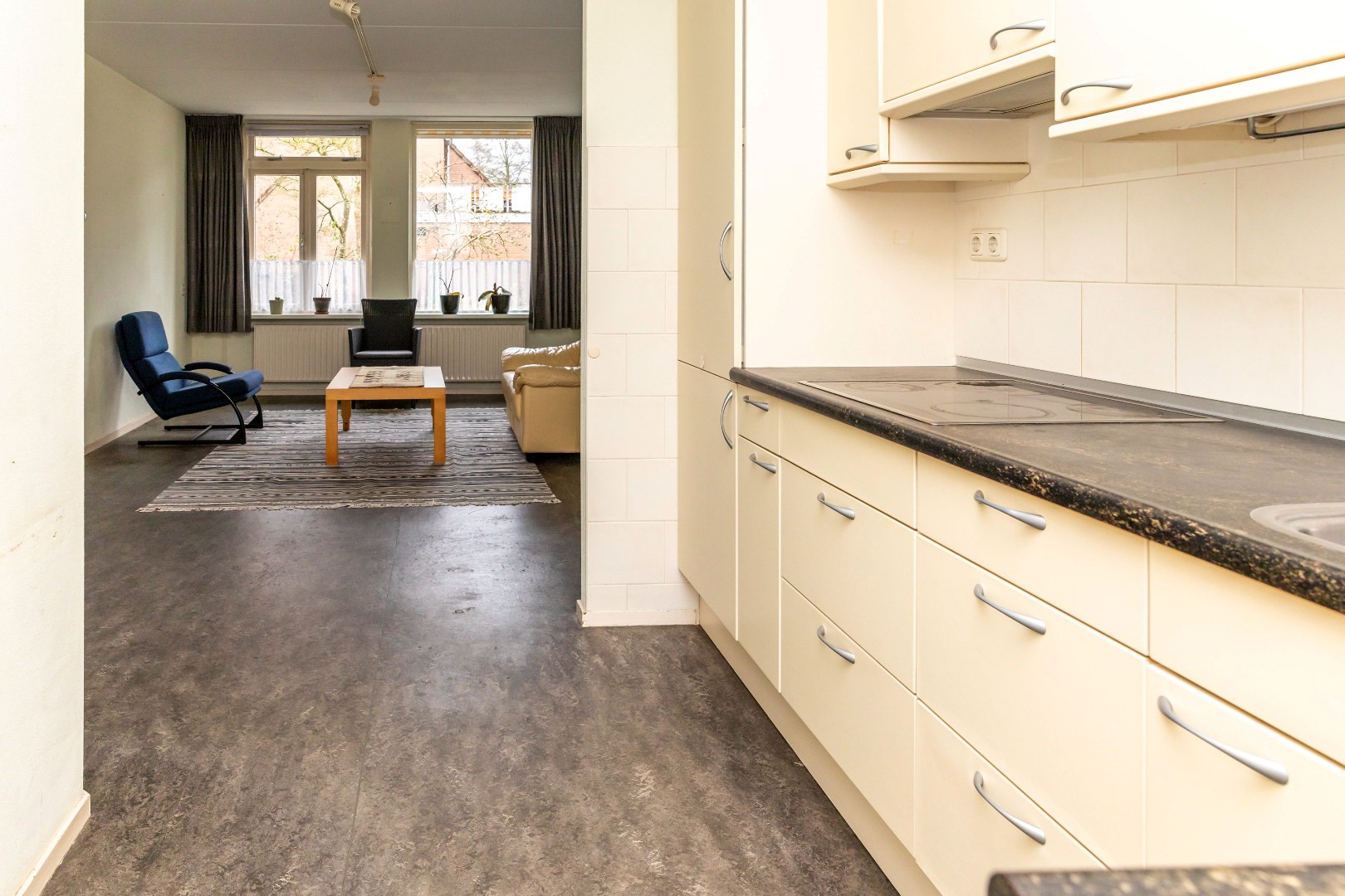 De keuken is eenvoudig uitgevoerd en voorzien van een keramische kookplaat, afzuigkap en een koel-vriescombinatie.