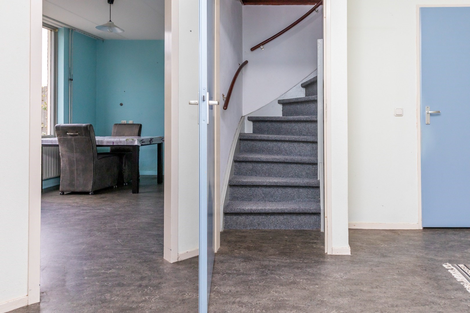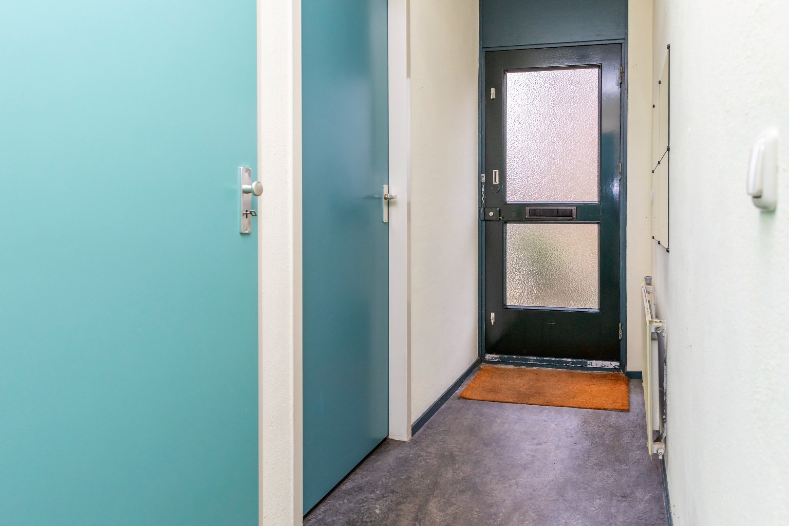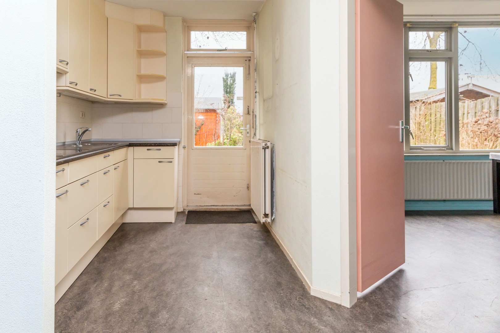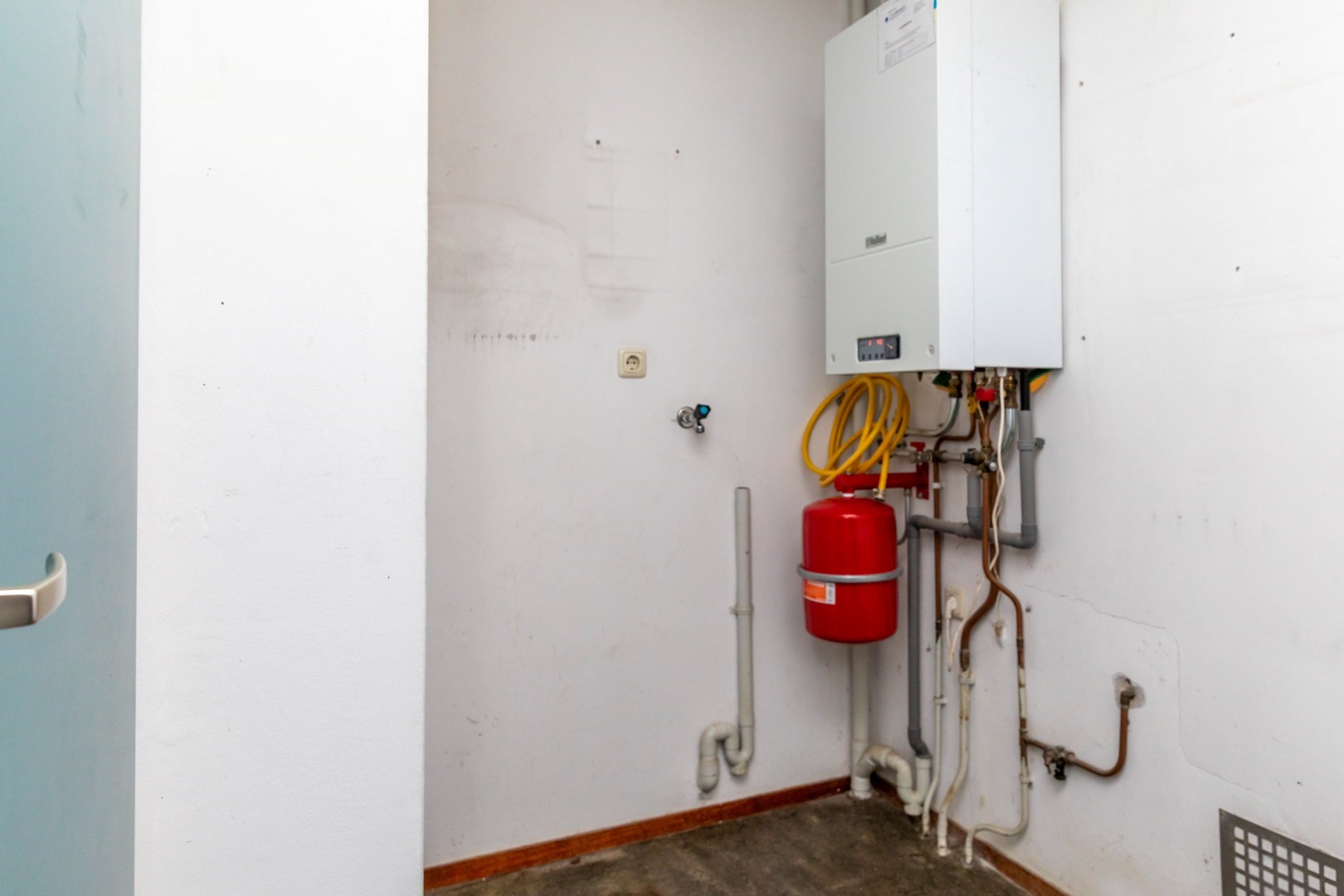 Aan de voorzijde van de woning bevindt zich de bijkeuken met wasmachineaansluiting en de opstelling van de c.v.-ketel.