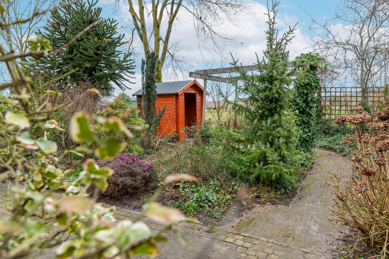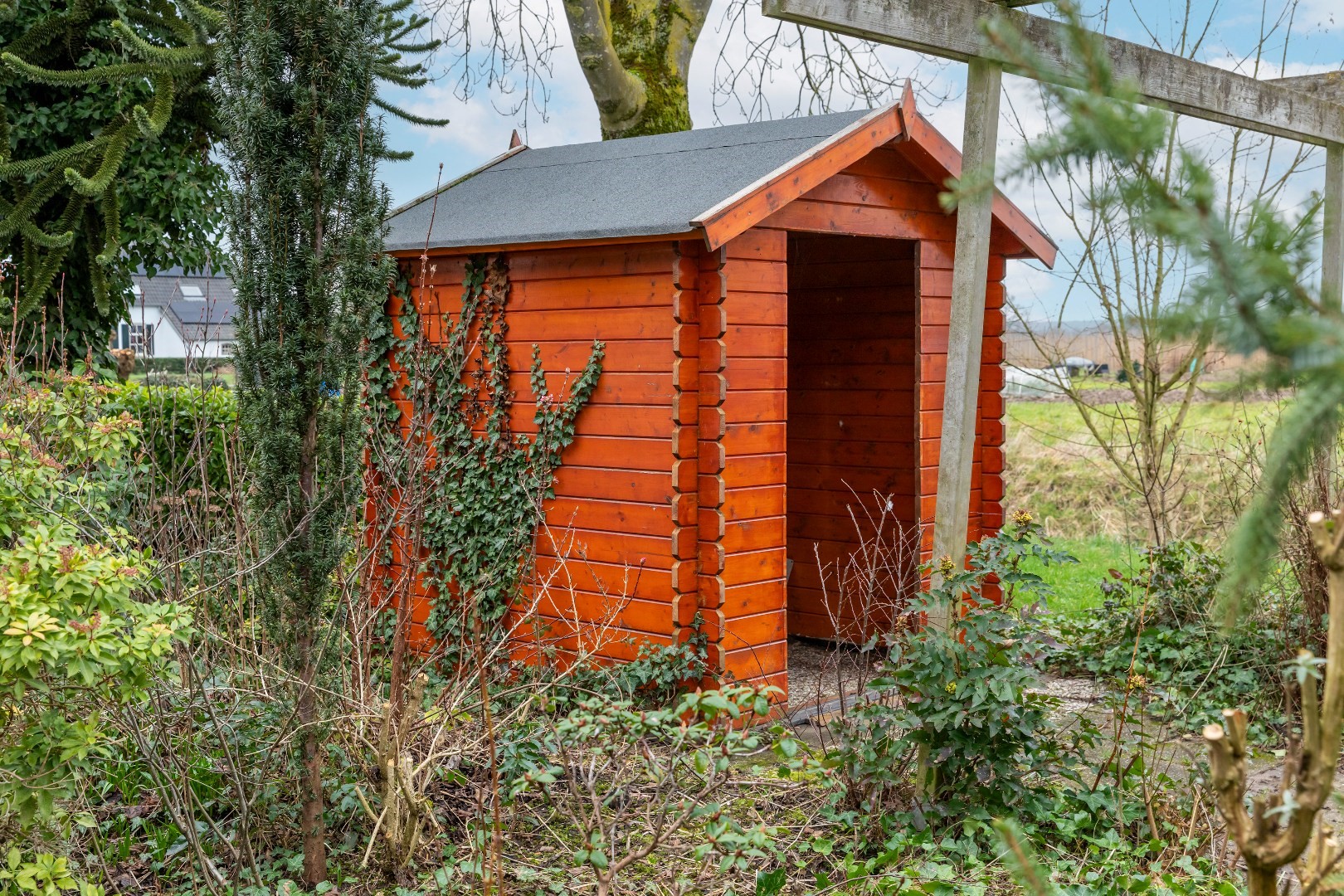 Achter in de tuin staat een kleine houten berging voor fietsen en tuingereedschap.