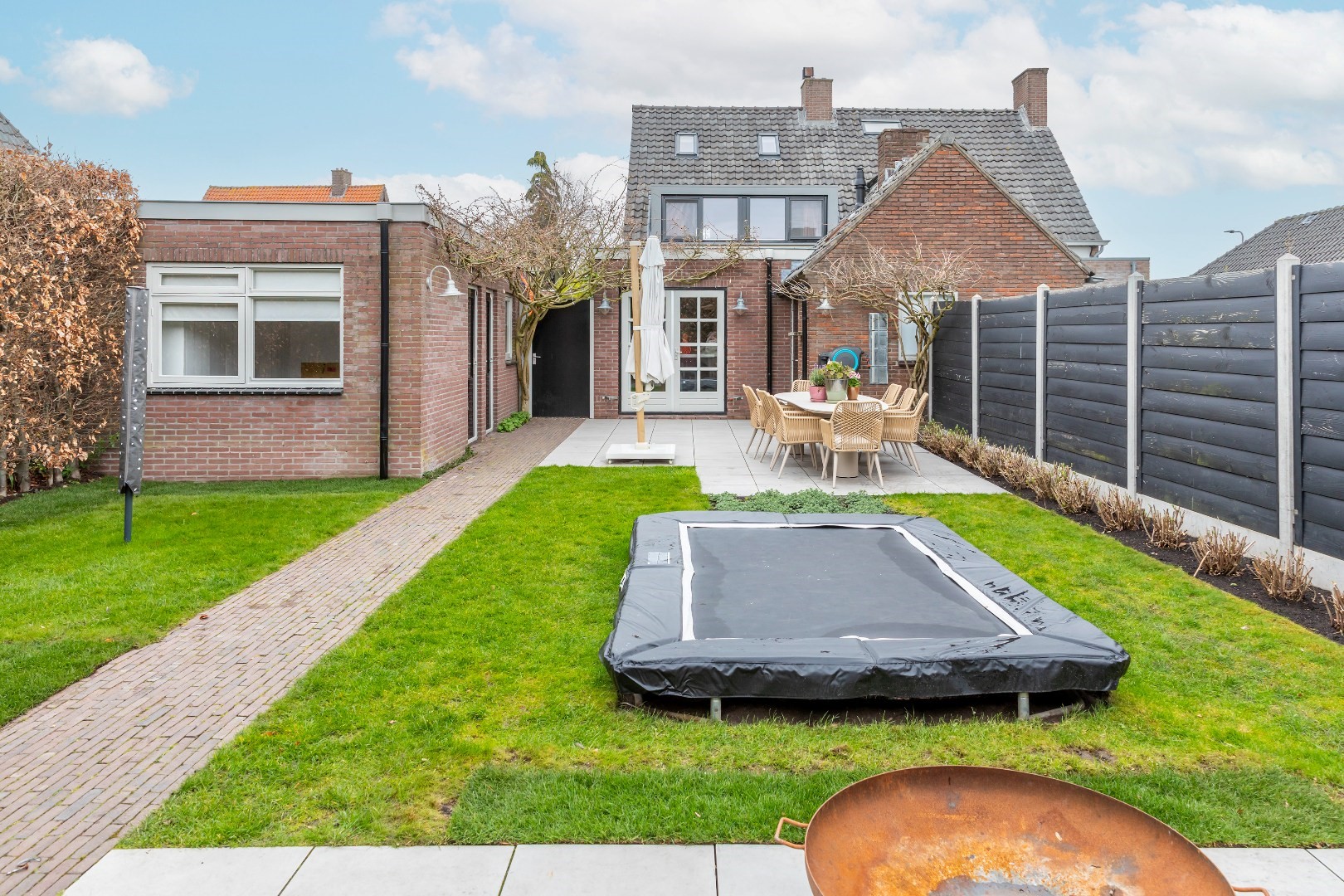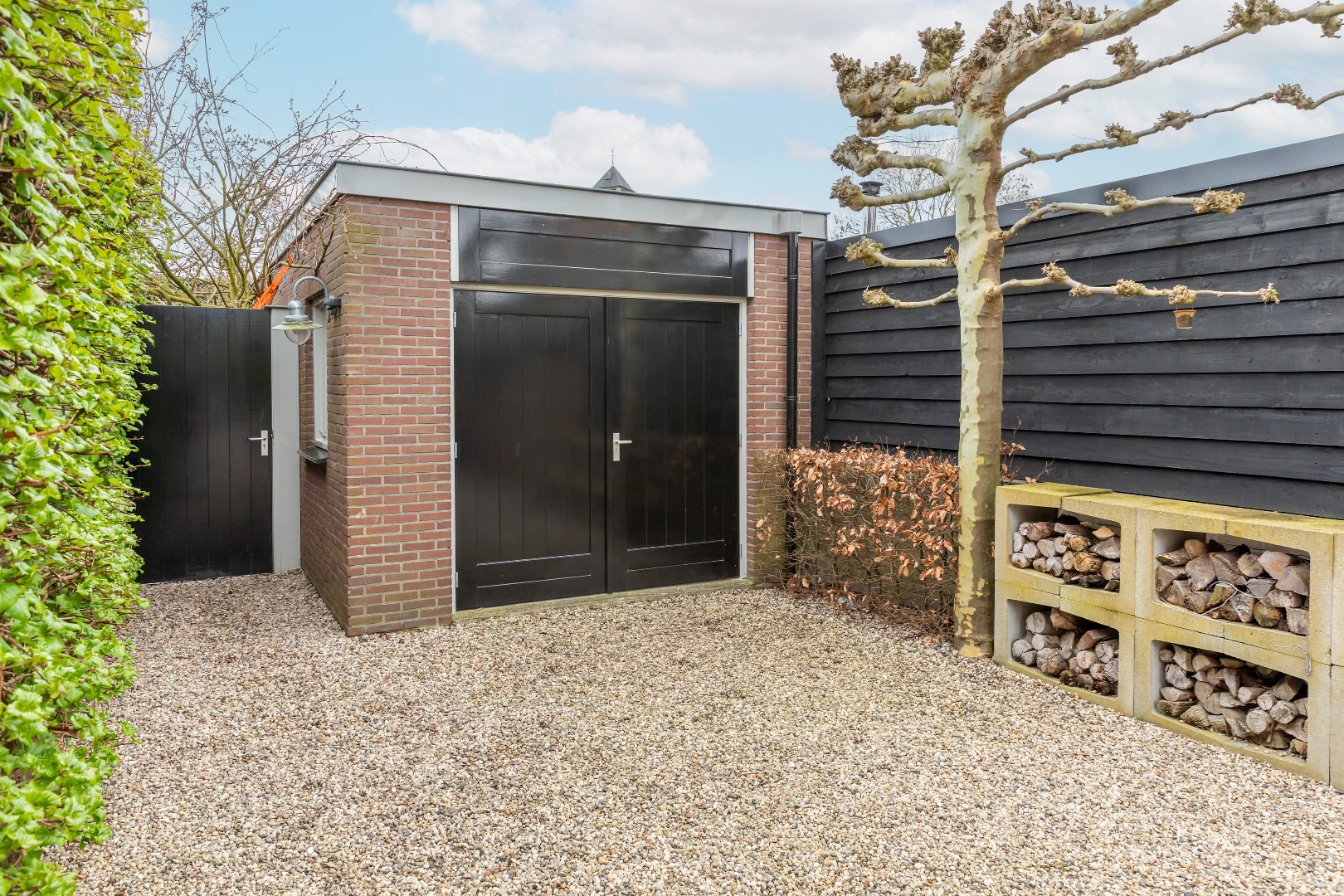 Tussen de woning en de vrijstaande garage bevindt zich een afsluitbare poort, ideaal als achterom en bijzonder handig bij tuinwerkzaamheden of het stallen van fietsen.