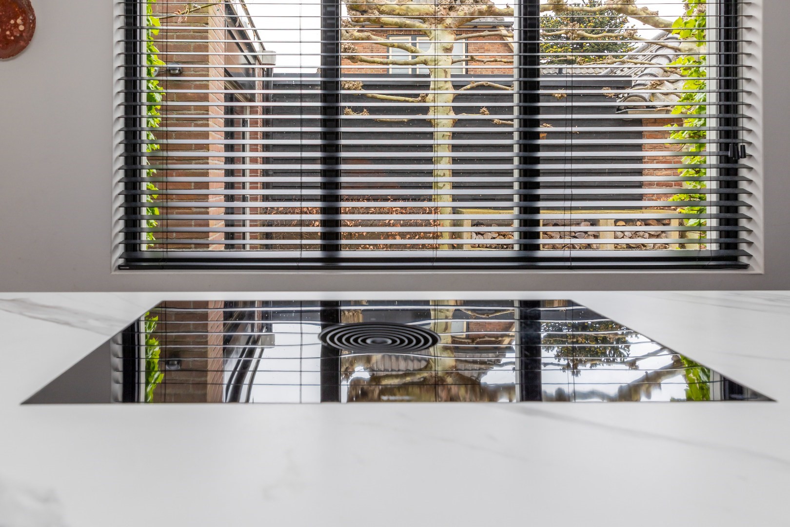 Voorzien van hoogwaardige apparatuur zoals een Bora-inductiekookplaat, Quooker, combi-oven, koelkast en een geïntegreerde koffiehoek, is werkelijk aan alles gedacht. Het royale kookeiland vormt de perfecte plek om samen te komen, terwijl je geniet van het uitzicht over de diepe, groene tuin.