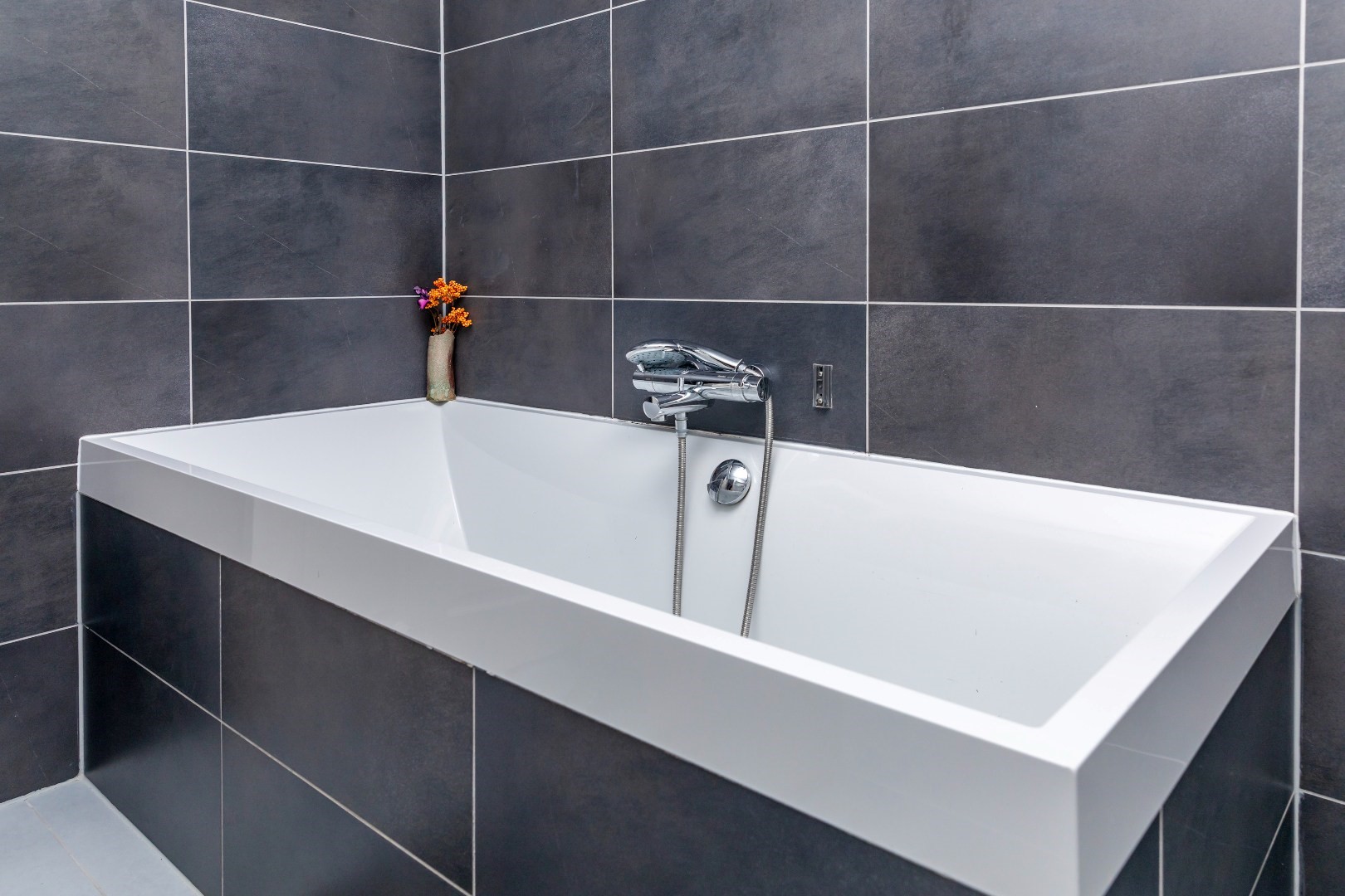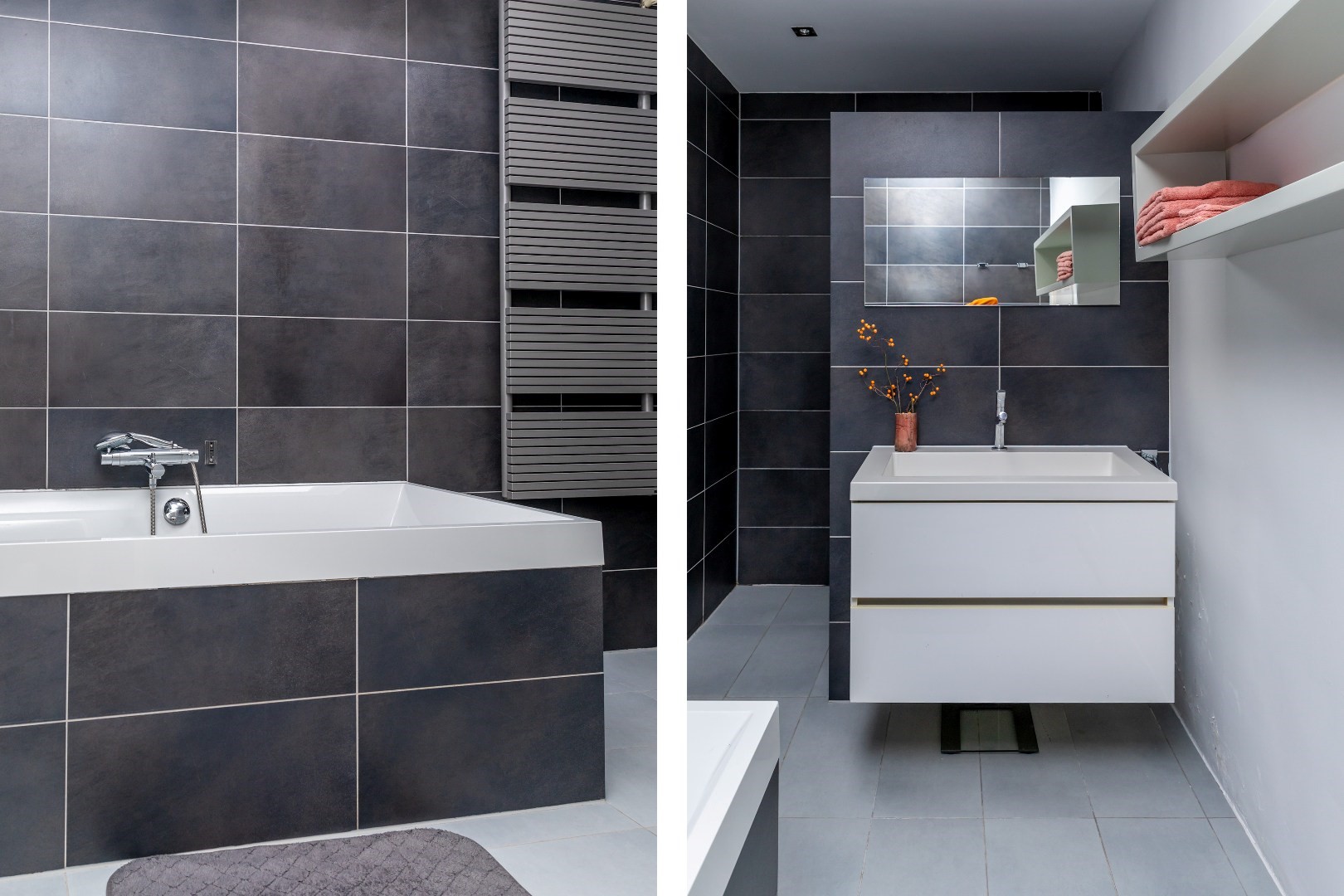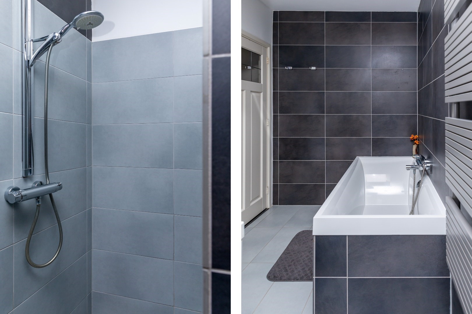 De complete badkamer is ruim opgezet en stijlvol uitgevoerd met een ligbad, royale inloopdouche en een fraai badmeubel.