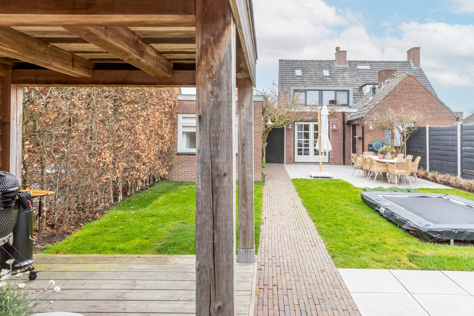 Achter in de tuin nodigt een sfeervolle overkapping uit tot lange zomeravonden, waar binnen en buiten naadloos in elkaar overlopen.