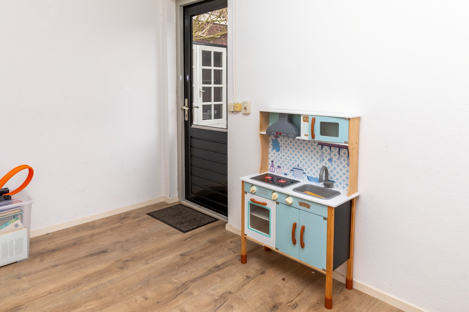 Momenteel in gebruik als speelruimte, maar met het prachtige zicht op de tuin is dit bij uitstek een inspirerende werkplek of rustige thuiswerkruimte.
