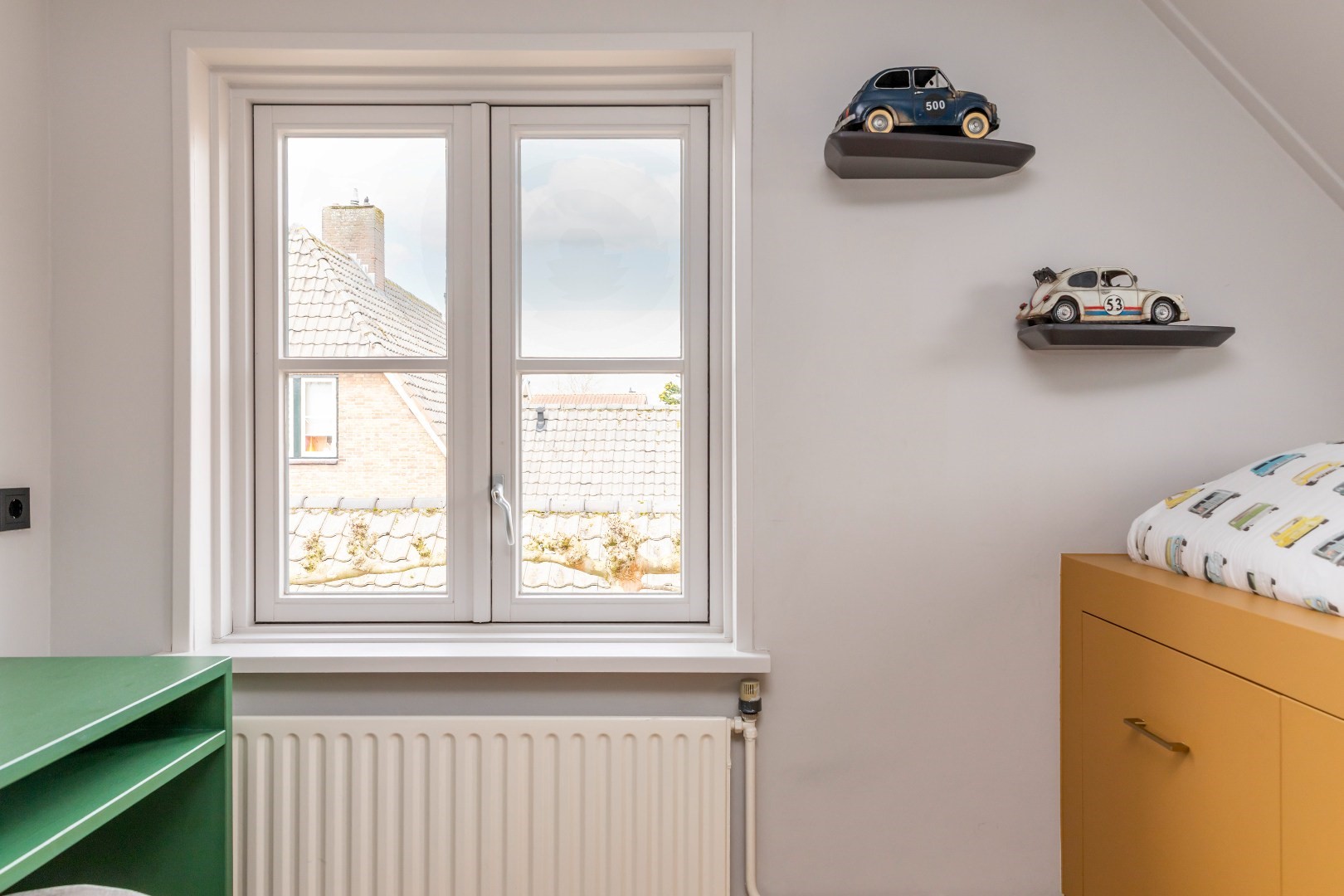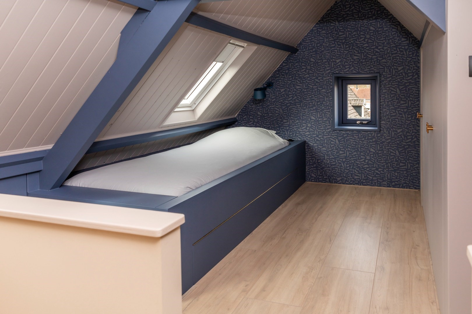 Ook hier is optimaal gebruikgemaakt van de ruimte, met praktische kastruimte en een prettige lichtinval, waardoor deze verdieping zich moeiteloos leent als volwaardige slaap-, werk- of hobbyruimte.