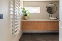 De badkamer is een plaatje – modern en sfeervol dankzij het gebruik van betonciré. Voorzien van vloerverwarming, mechanische ventilatie, een ruime inloopdouche, een vrij-hangend toilet, een fraaie waskom en veel bergruimte.