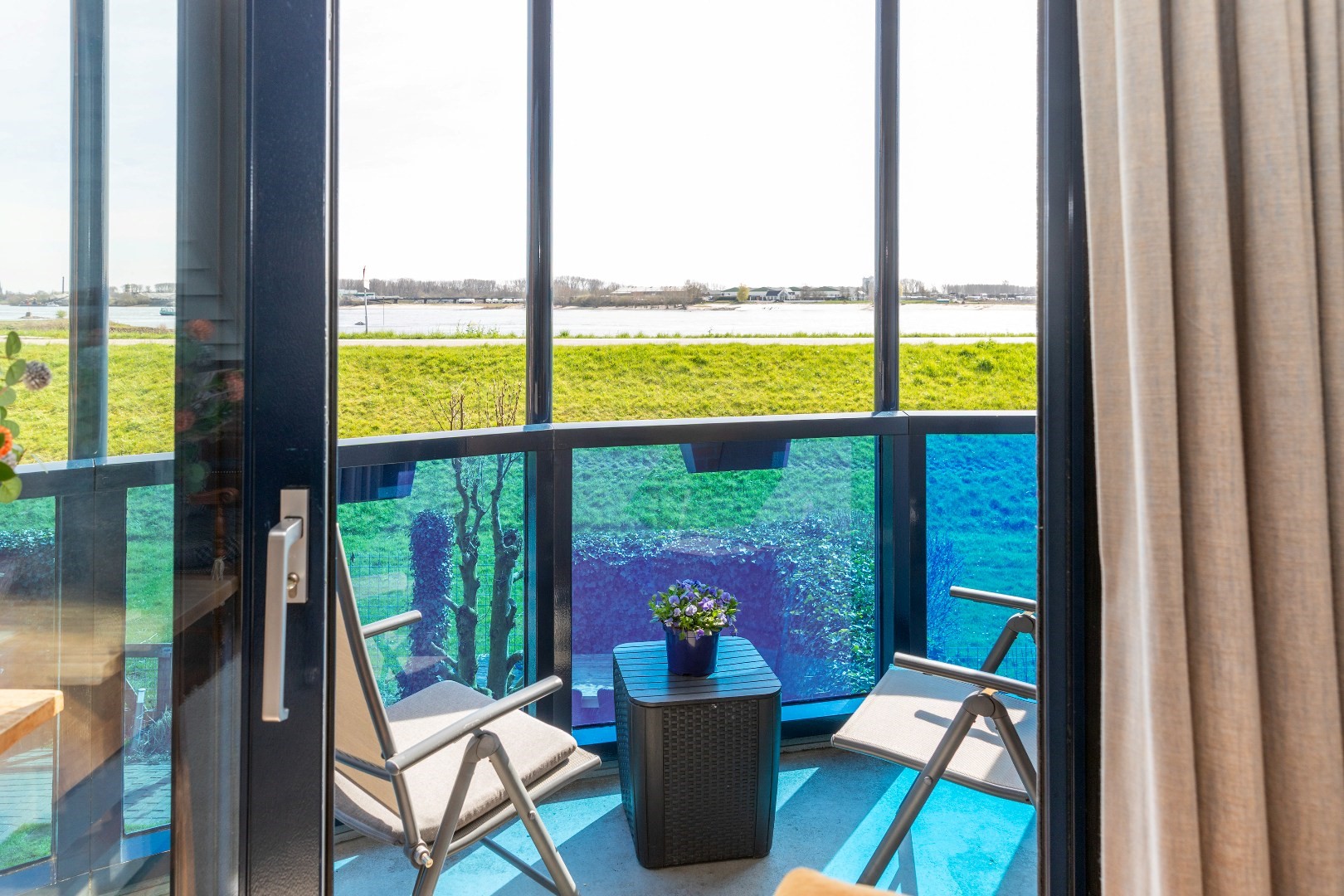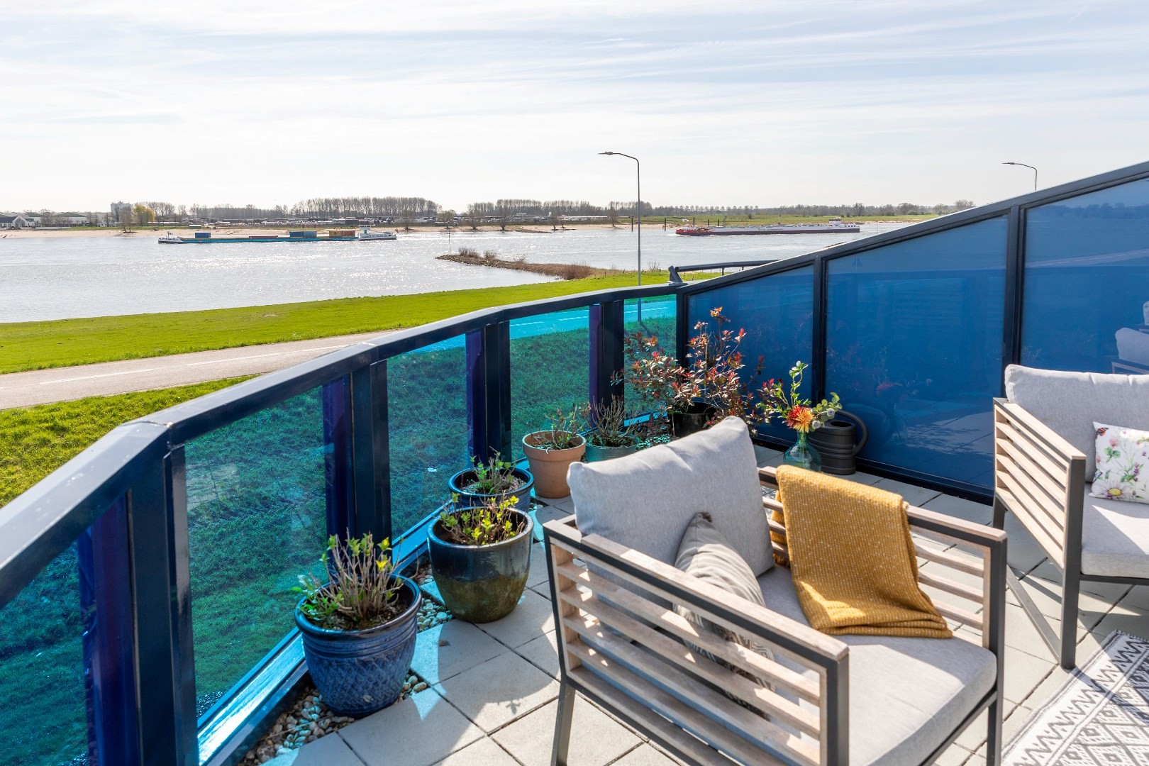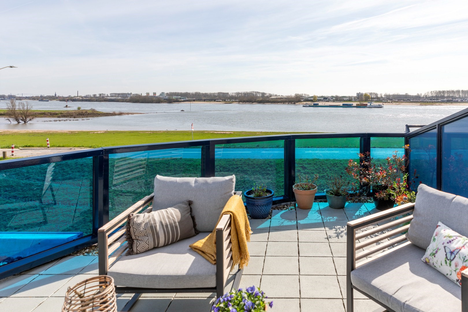 Hoog gelegen, licht en ruim, met een indrukwekkend zicht over de dijk en de rivier.