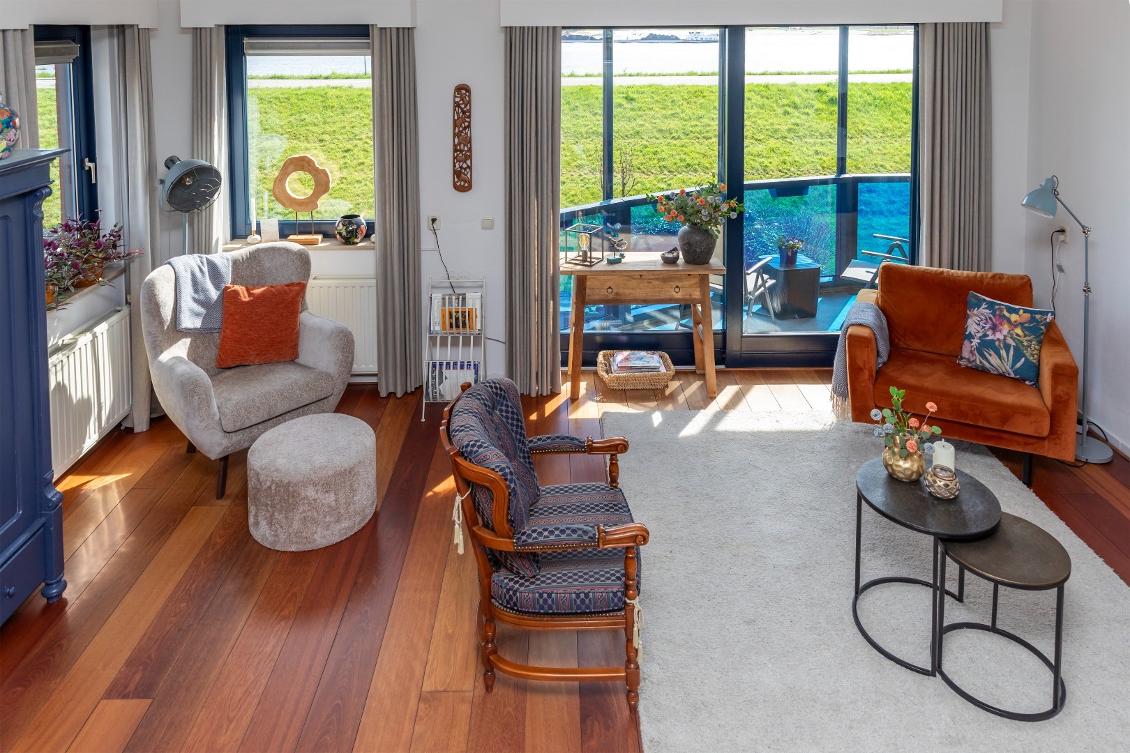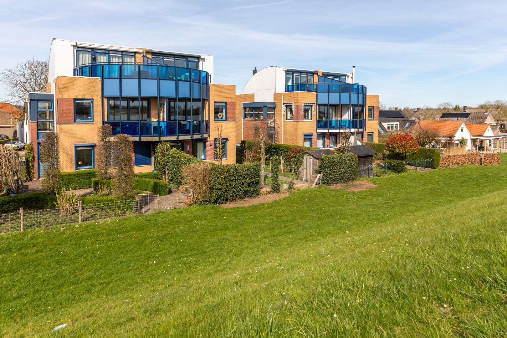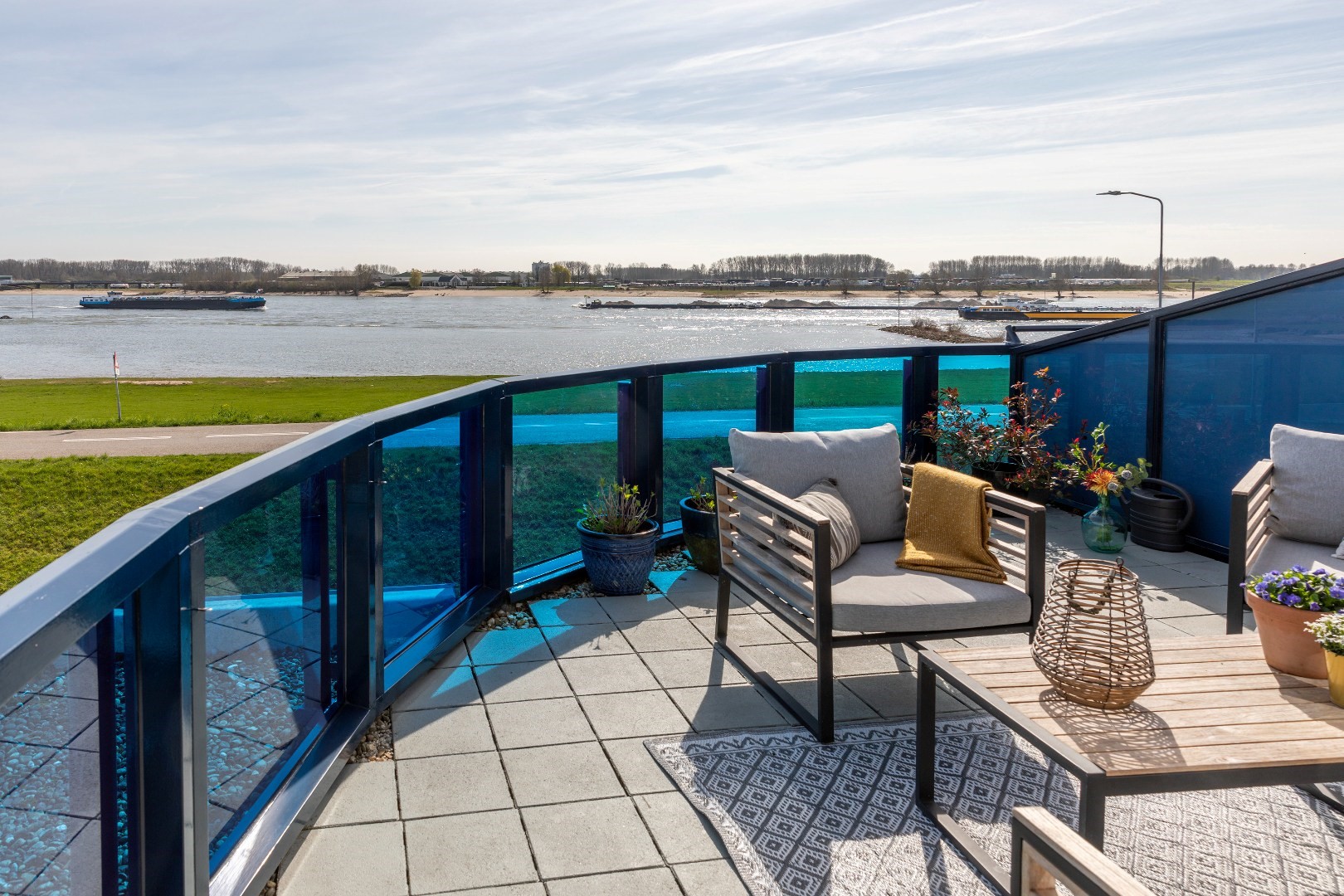 Hoog gelegen, licht en ruim, met een indrukwekkend zicht over de dijk en de rivier.