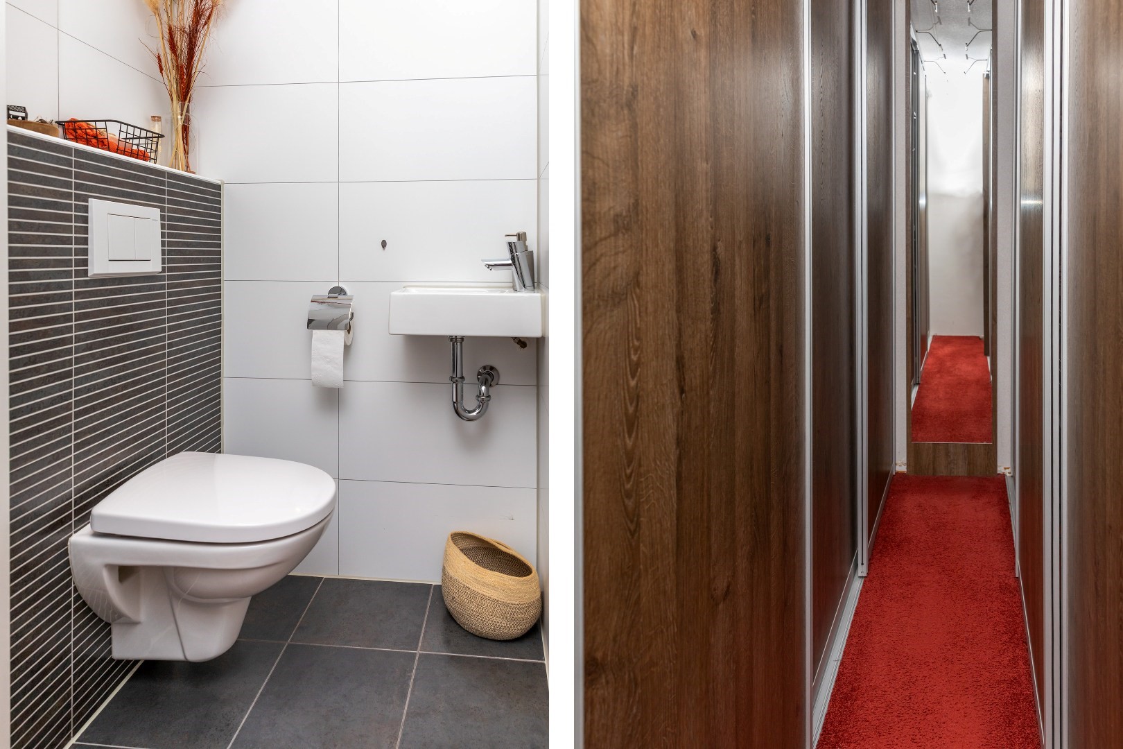 Naast de keuken is de praktische bijkeuken met kastruimte (berging) en aansluitingen voor de wasmachine en droger.