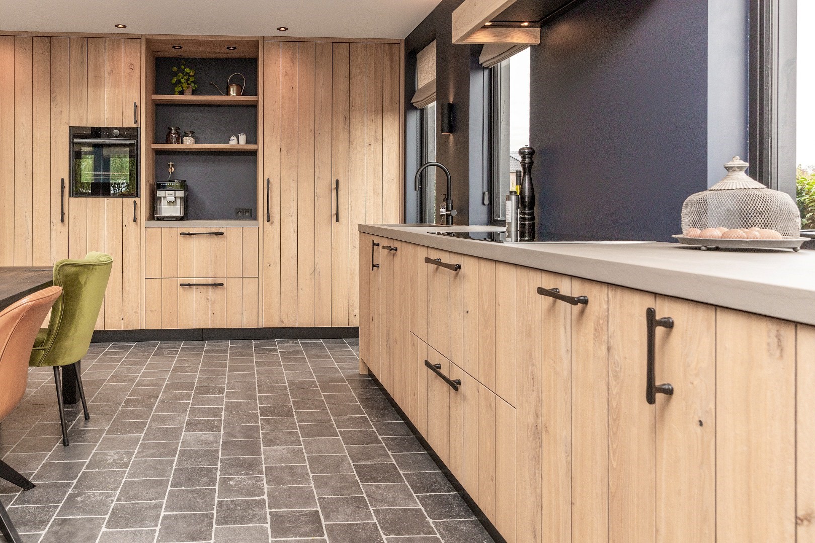 landerijen. De maatwerk eikenhouten keuken van MK Timmerwerken, met lavastenen