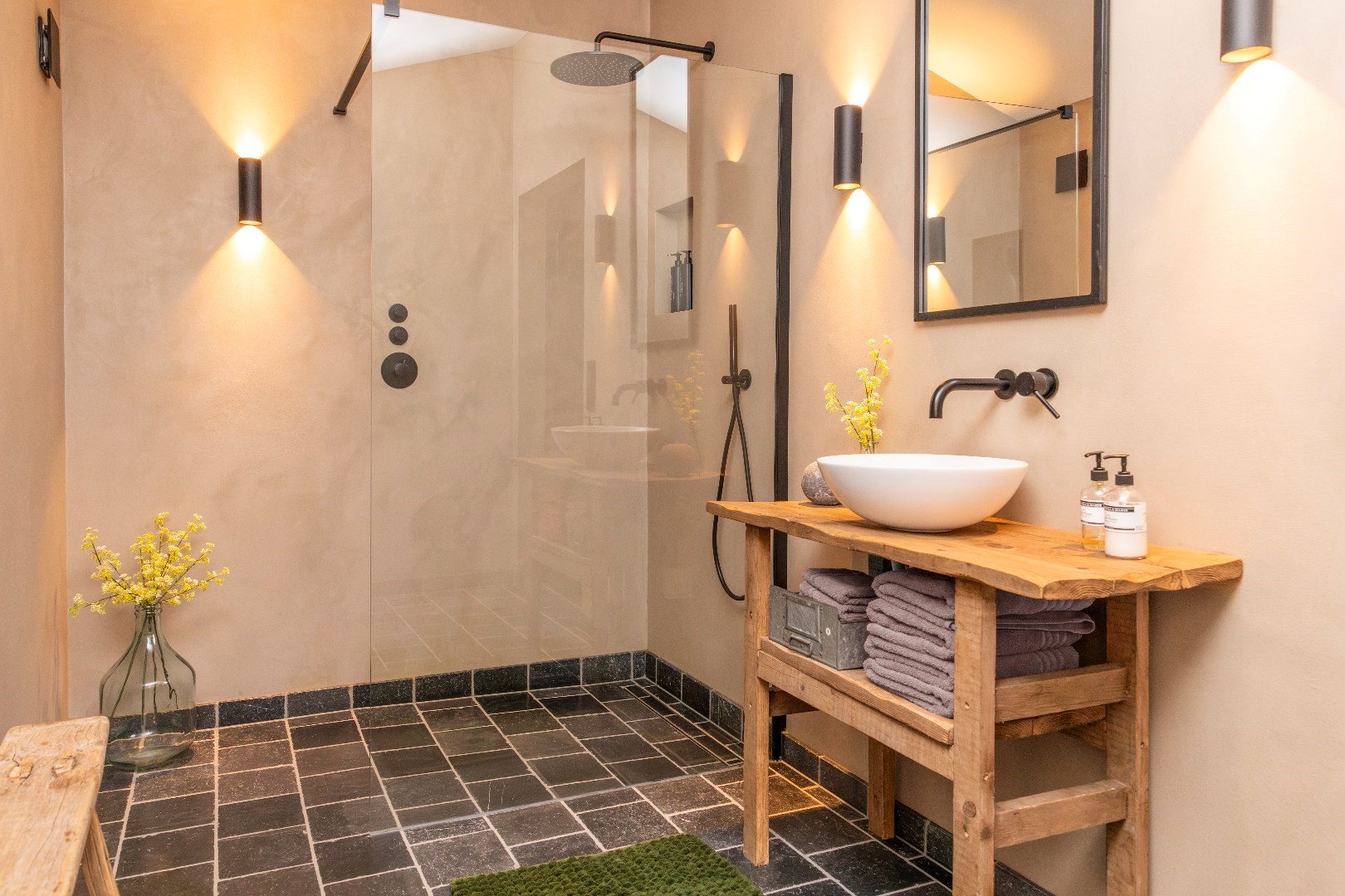 De badkamer uit 2020 is royaal en geeft u pure wellness in eigen huis. De wandafwerking is ook