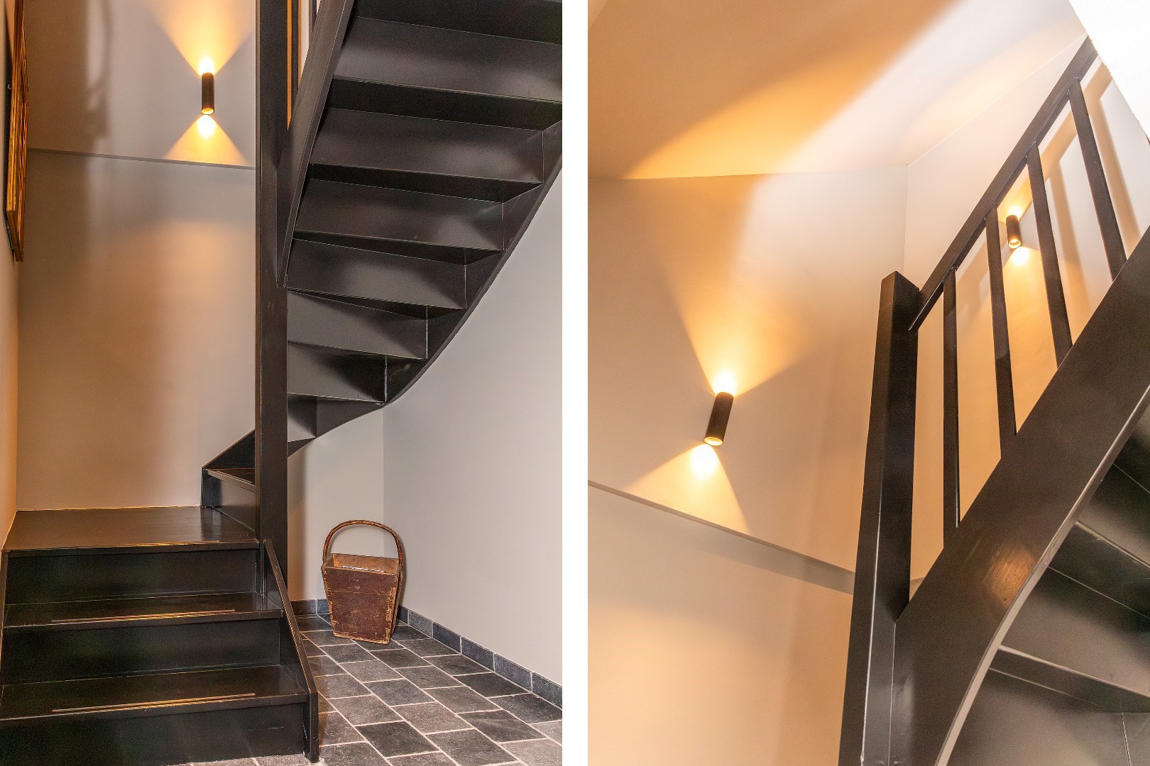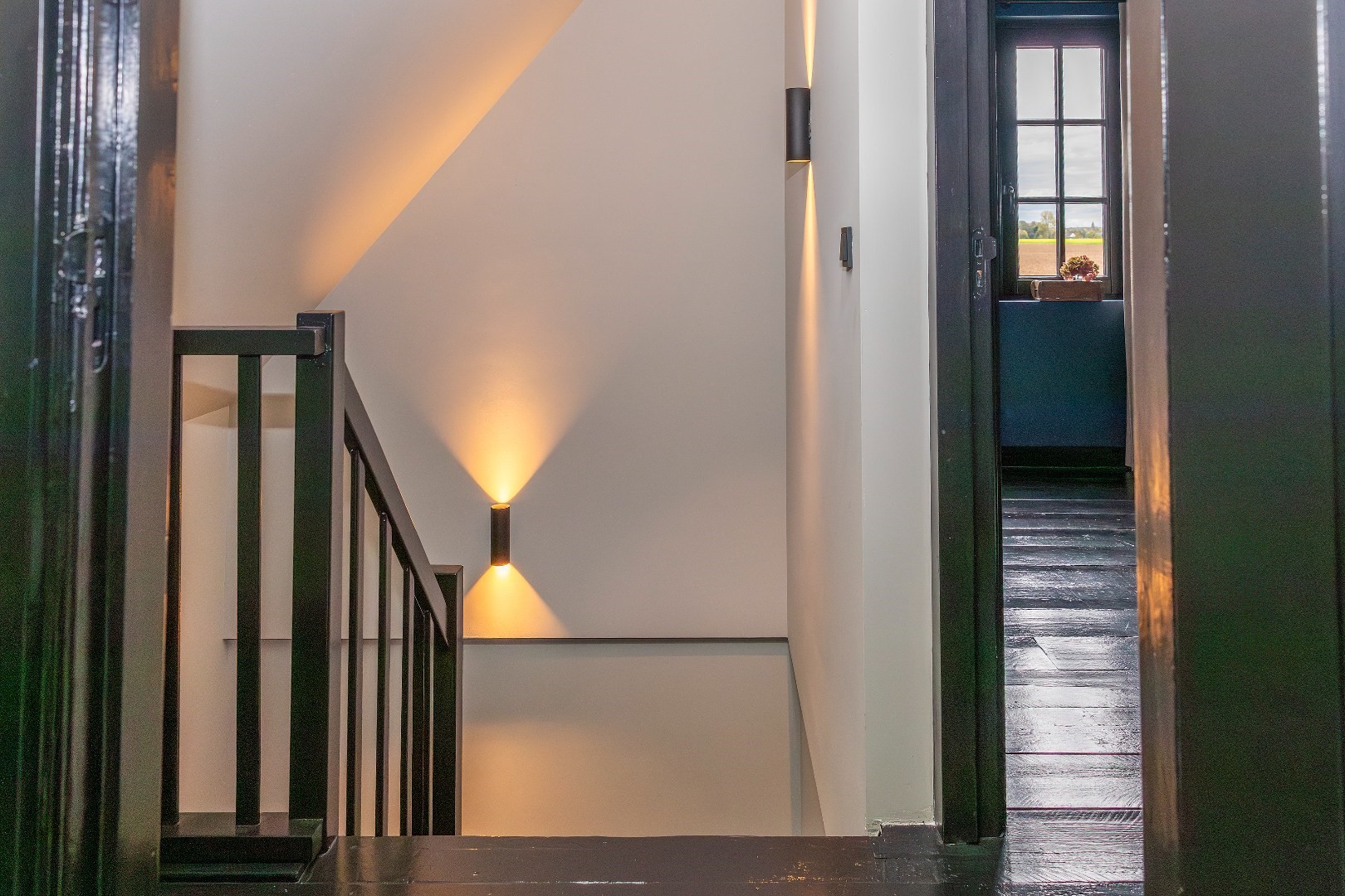 Een bordestrap leidt naar de eerste verdieping, waar twee slaapkamers zijn gesitueerd. Beide