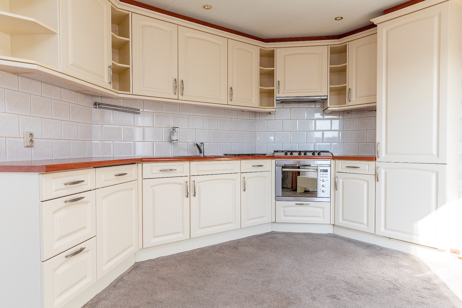 De lichte inbouwkeuken heeft een gaskookplaat, afzuigkap, combi-oven, koelkast en vriezer.