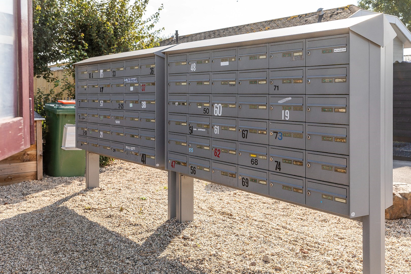 Verzorgd park met goede voorzieningen: slagboom met pas, centrale brievenbussen en afvalinzameling bij de ingang.